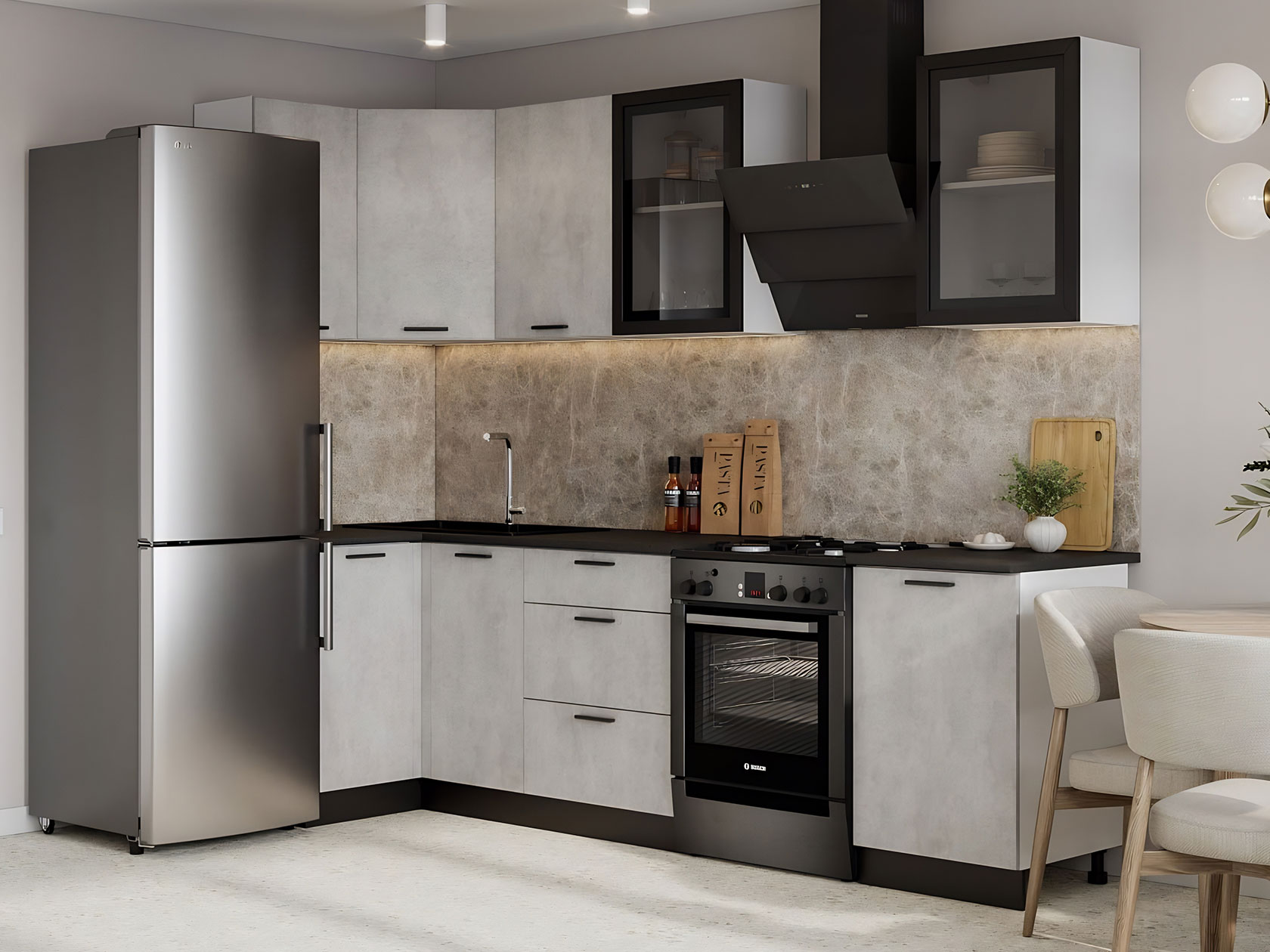 Кухонный гарнитур Модус 210х100 см со стеклом Белый / Цемент светлый / Черный, стекло