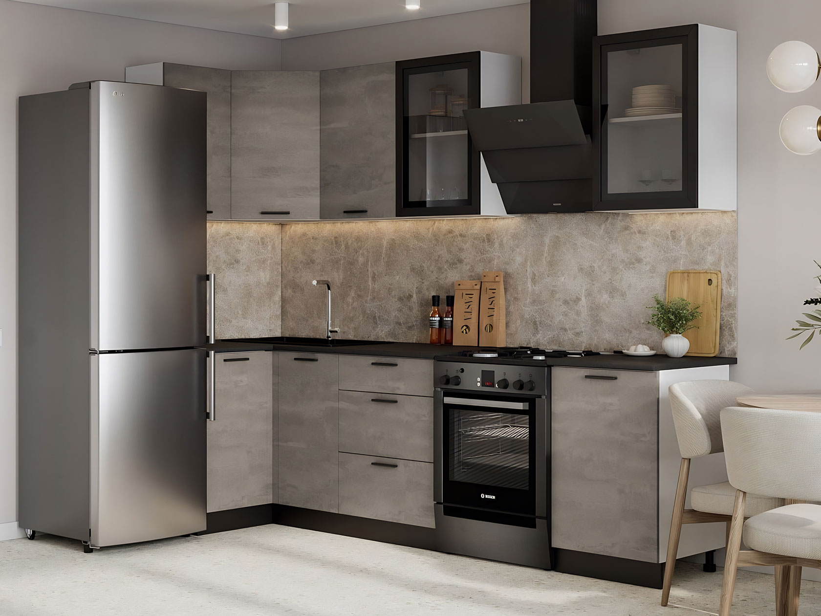 Кухонный гарнитур Модус 210х100 см со стеклом Белый / Камень темный / Черный, стекло