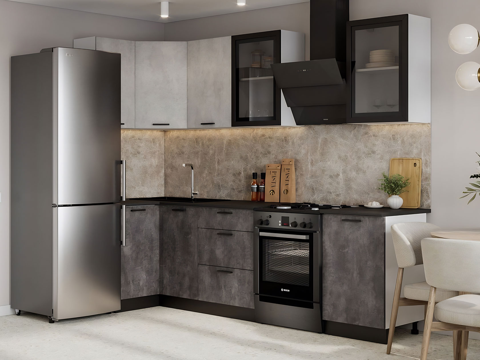 Кухонный гарнитур Модус 210х100 см со стеклом поможет эффективно использовать пространство, организовав место для хранения продуктов и приготовления пищи. Стеклянные элементы придают интерьеру визуальную легкость и позволяют продемонстрировать красивую посуду и декор.