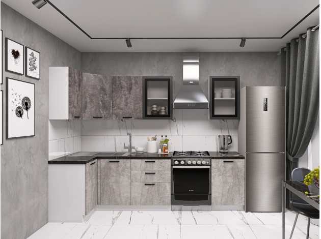 Кухонный гарнитур Модус 210х100 см со стеклом Белый / Цемент темный / Черный, стекло / Цемент светлый