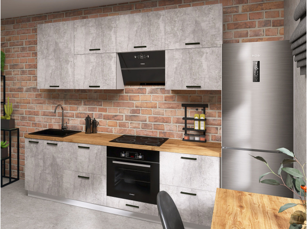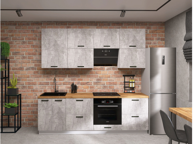 Кухонный гарнитур Модус 240 см с антресолями — отличный выбор для организации функционального рабочего пространства. Прямая конфигурация дает возможность расположить все элементы вдоль одной стены. Антресольные шкафы позволяют эффективно использовать верхнюю часть гарнитура для хранения посуды и кухонной утвари.