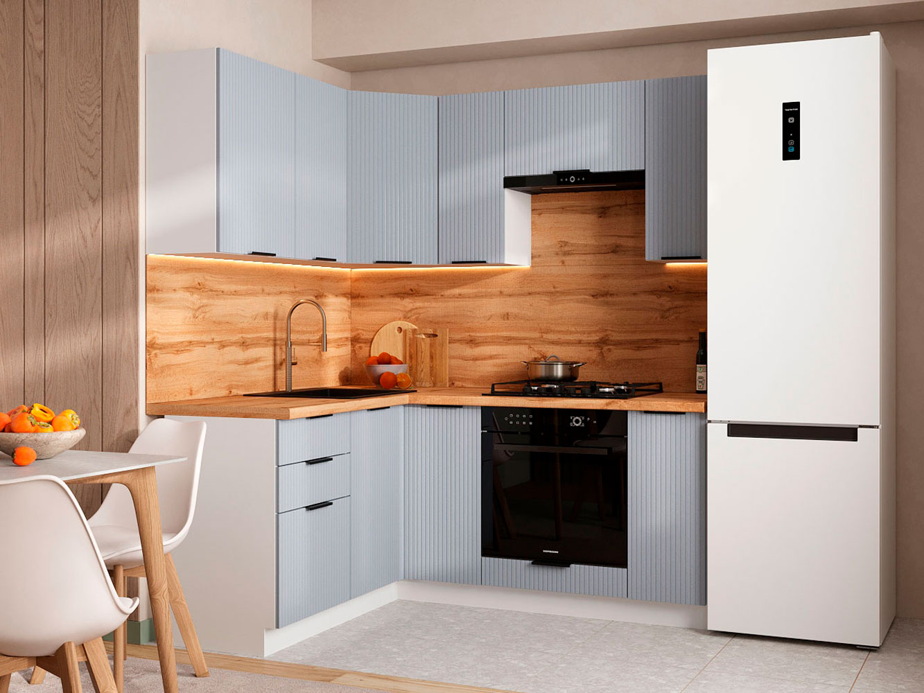 Кухонный гарнитур Муссон 180х150 см создаст комфортное пространство для ежедневных дел. Угловая конструкция позволяет разместить необходимую утварь и посуду, а также создать удобную рабочую зону для готовки. Матовые фасады с узором из вертикальных линий актуально смотрятся в современном интерьере.