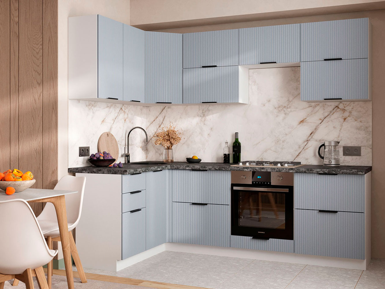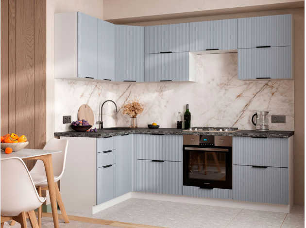 Кухонный гарнитур Муссон 240х140 см — готовое решение для оформления пространства по правилу рабочего треугольника. Удобное расположение элементов и их оптимальное наполнение позволят с удовольствием готовить любимые блюда. Вертикальный принт на фасадах и контрастная фурнитура придают мебели привлекательный и элегантный вид.