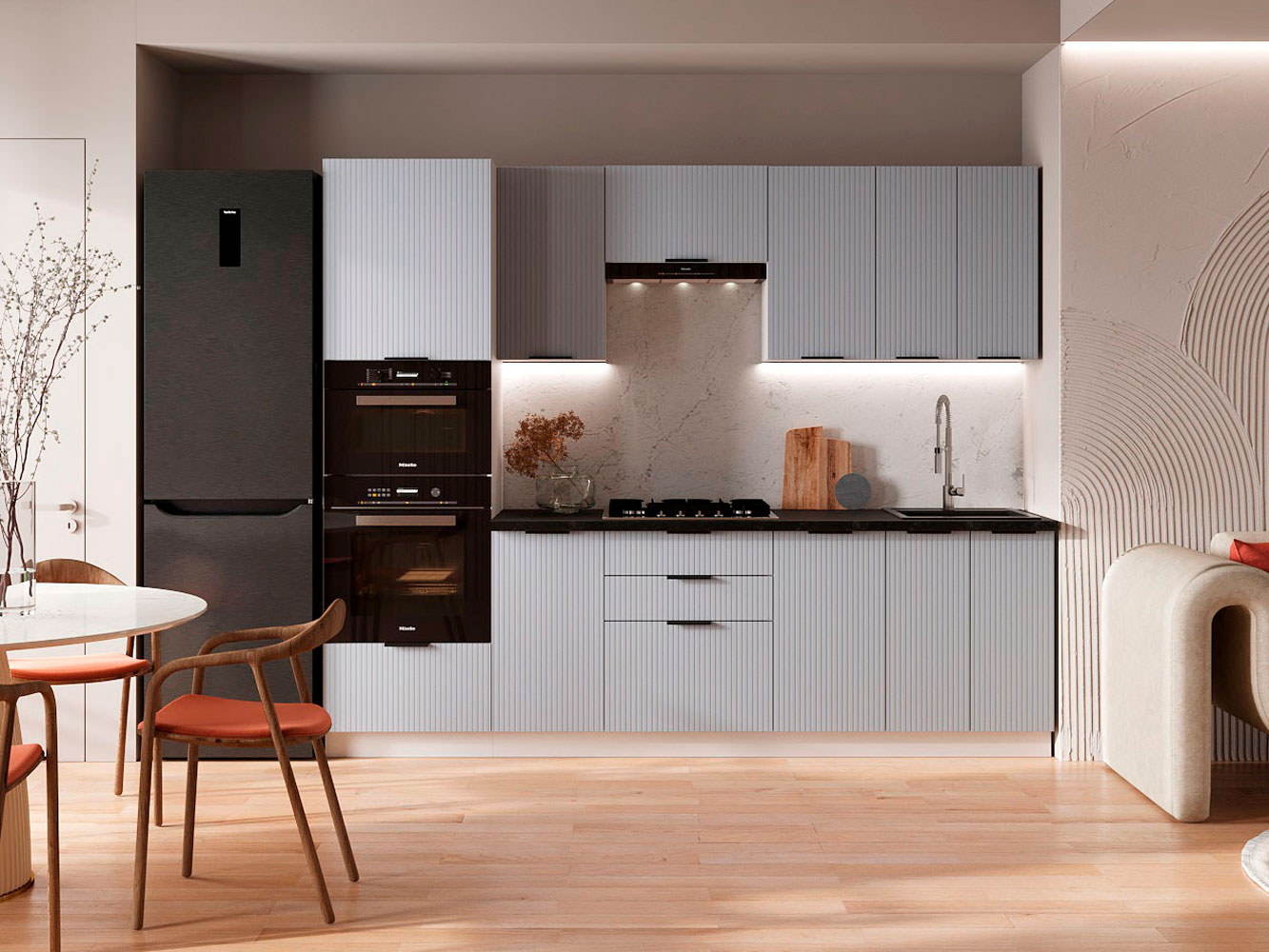 Кухонный гарнитур Муссон 260 см поможет организовать удобное хранение и создаст уютное пространство для приготовления блюд. Благодаря вертикальному узору и контрастной фурнитуре мебель добавит интерьеру стильные акценты. За матовыми фасадами легко ухаживать, поддерживая их привлекательный вид.
