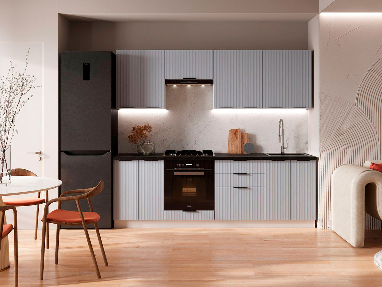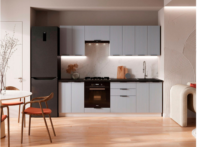 Кухонный гарнитур Муссон 240 см — готовое решение для оформления современного интерьера с удобной системой хранения. Мебель позволяет органично вписать бытовую технику и разместить под рукой всё необходимое для приготовления пищи. Принт на фасадах в виде вертикальных линий и контрастные тонкие ручки гармонично дополняют друг друга, создавая уютную атмосферу.