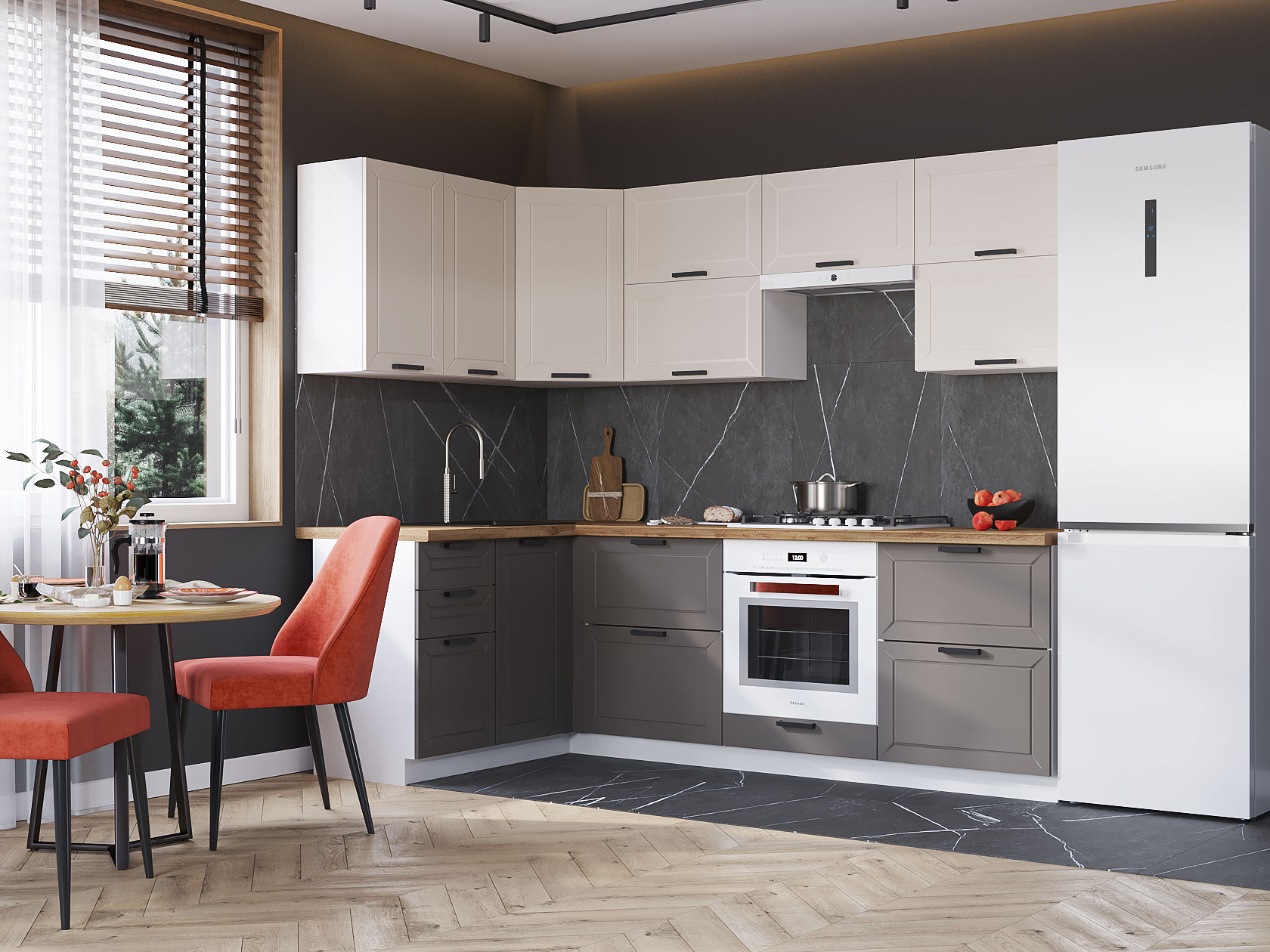 Кухонный гарнитур Оптима 240х140 см создаст вместительную систему хранения и комфортное пространство для приготовления пищи. Угловая конструкция поможет разумно использовать площадь. Функциональные элементы с полками и ящиками позволят удобно разместить всю необходимую утварь и посуду. Аккуратные рамочные фасады с матовой поверхностью привлекательно выглядят и не перегружают интерьер.