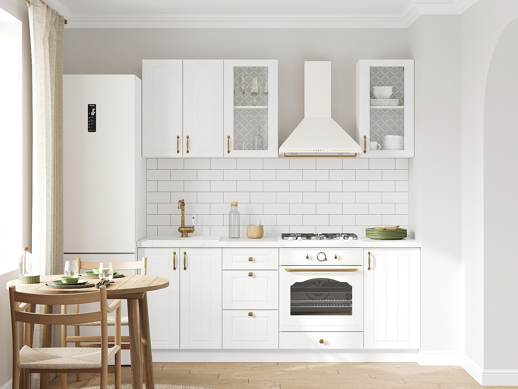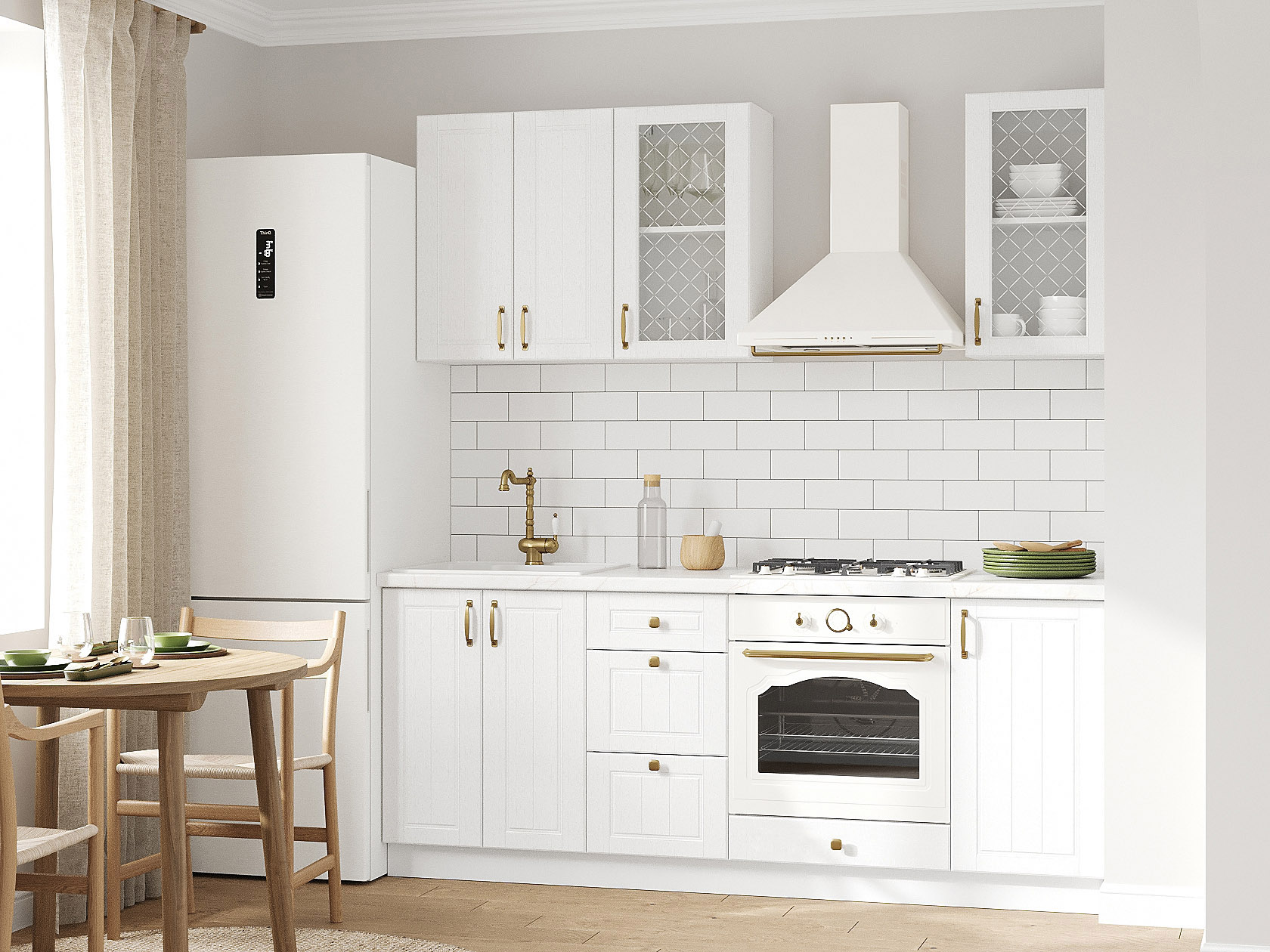 Кухонный гарнитур Прованс 200 см позволит эффективно использовать доступное пространство. В верхнем ряду расположены два шкафа-витрины с узором на стекле, которые не только расширяют возможности для хранения, но и придают обстановке привлекательный вид. Фасады дополнены декоративными рамками и фурнитурой в золотом оттенке.