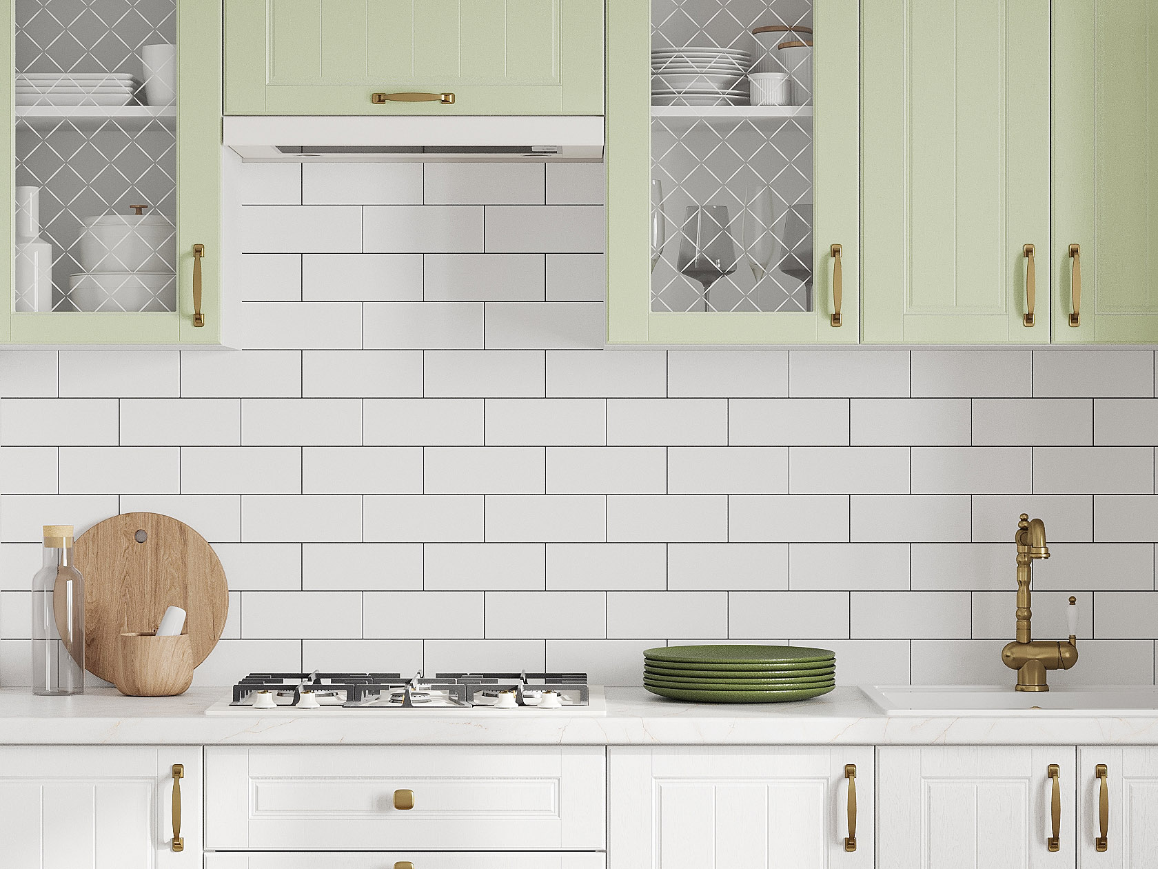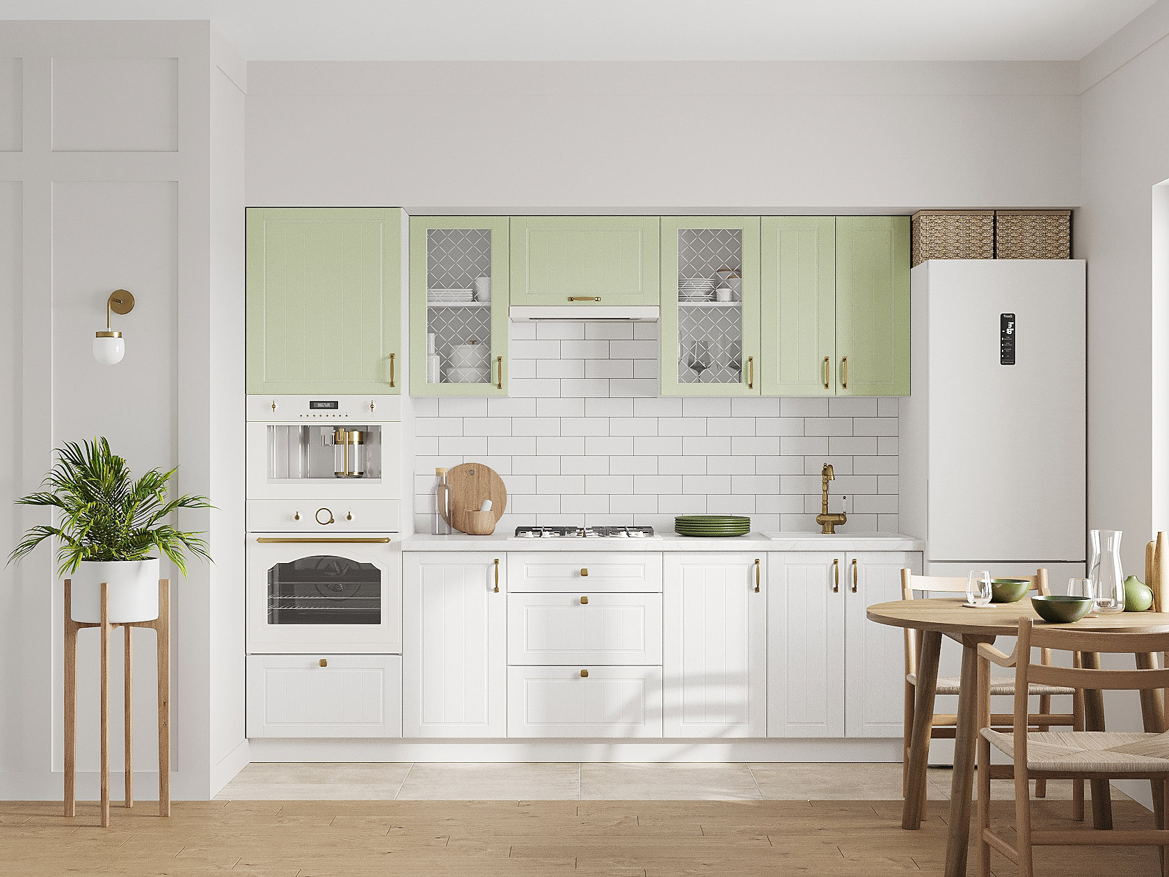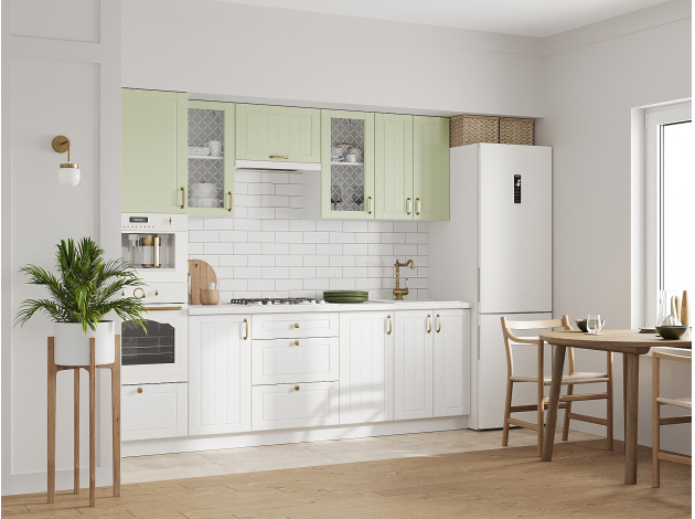 Кухонный гарнитур Прованс 260 см Белый / Фисташковый структурный со стеклом / Белый текстурный