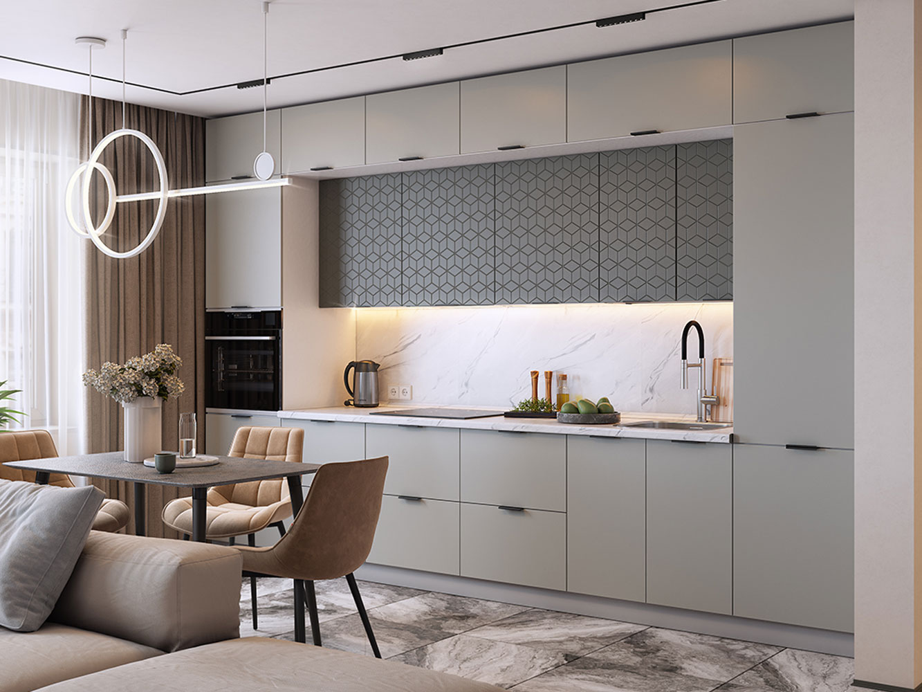 Кухонный гарнитур Стоун 380 см — идеальное решение для большого помещения. В наборе есть всё, что нужно для удобного хранения и комфортного приготовления пищи. Фасады с необычной фрезеровкой оживляют обстановку. Благодаря цоколю интерьер смотрится завершенным и эстетичным.
