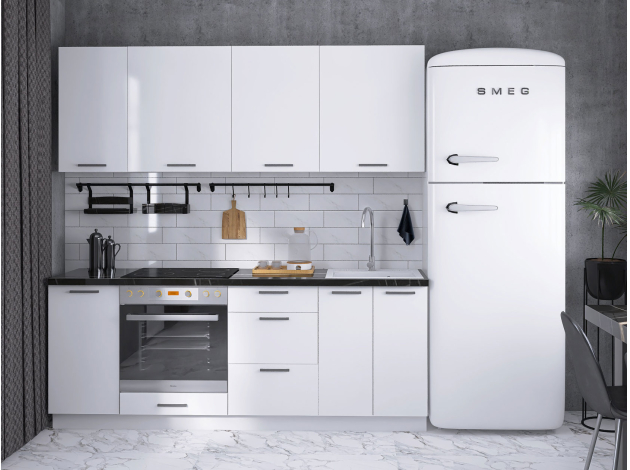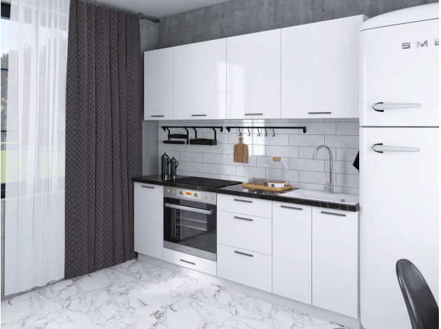 Кухонный гарнитур Стрэйт 210 см — тщательно продуманное решение для хранения посуды, продуктов и аксессуаров. Глянцевые фасады визуально расширяют пространство и удачно сочетаются с разными фактурами и оттенками. Благодаря специальному покрытию поверхность устойчива к различным повреждениям, воздействию ультрафиолета, влаги и высоких температур.
