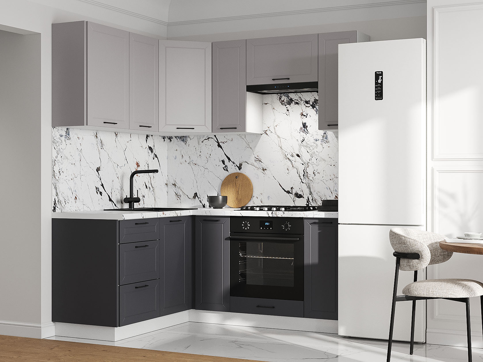 Кухонный гарнитур Вектор 180х150 см поможет организовать удобное хранение продуктов, аксессуаров и различной посуды. Угловая конструкция экономит пространство и позволяет адаптировать набор для небольшой квартиры. Здесь очень приятно и комфортно готовить, потому что всё необходимое находится под рукой. Фасады декорированы фрезеровкой, которая придает мебели элегантный вид.