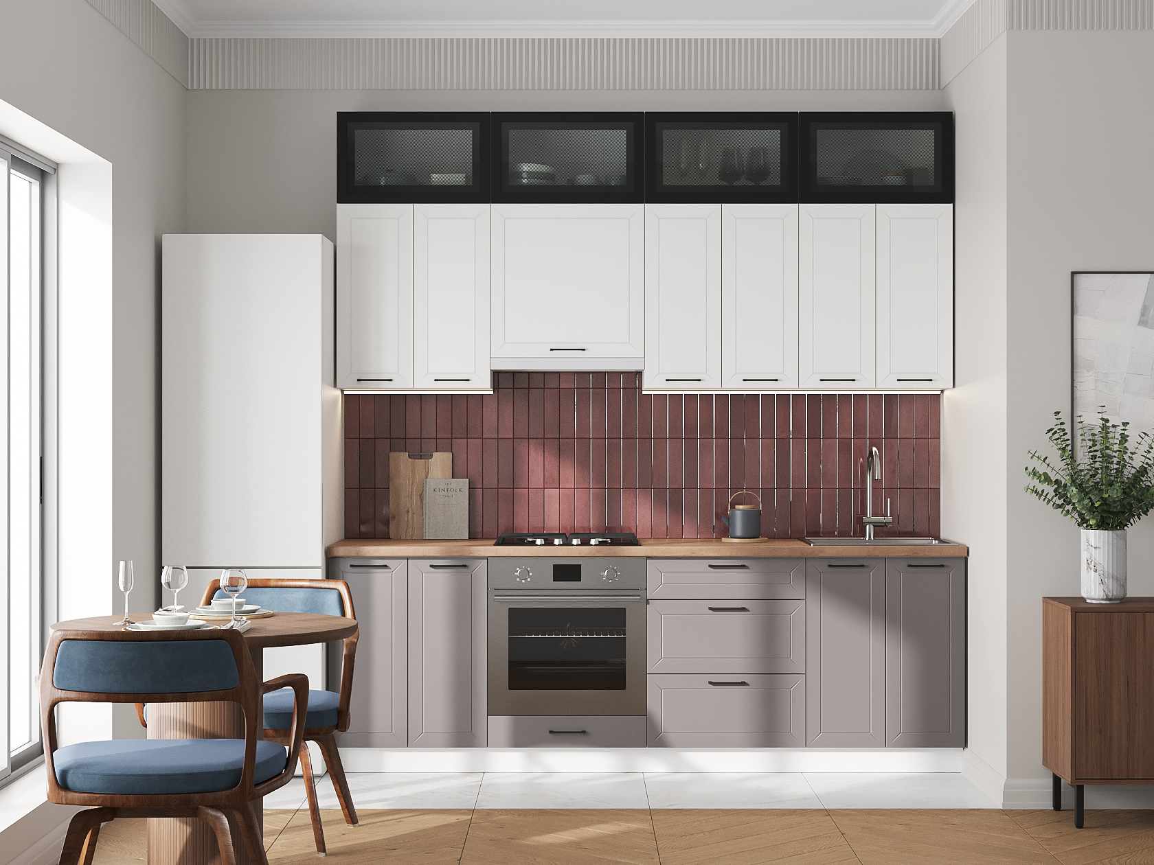 Высокий кухонный гарнитур Вектор 240 см с антресольными шкафами Белый / Бланж / Грей / Черный / Стекло