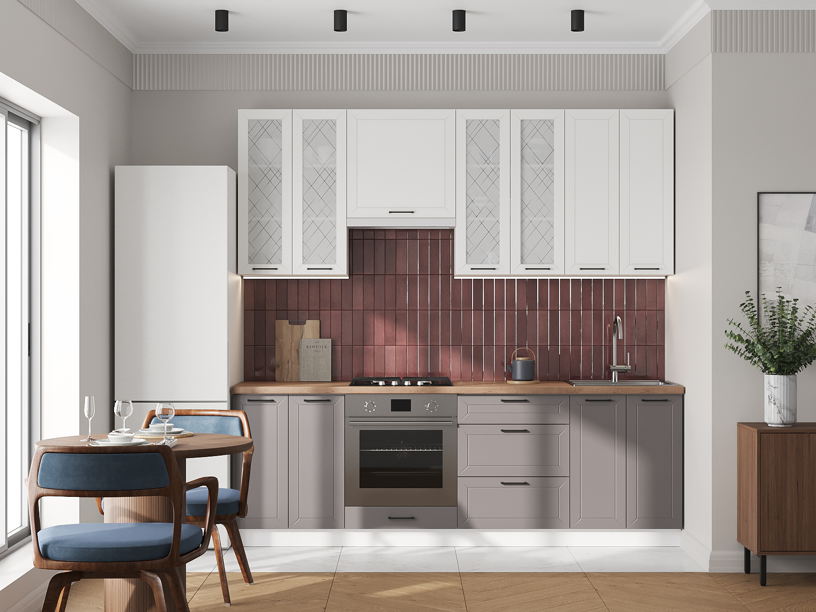 Высокий кухонный гарнитур со стеклом Вектор 240 см Белый / Бланж / Грей / Стекло