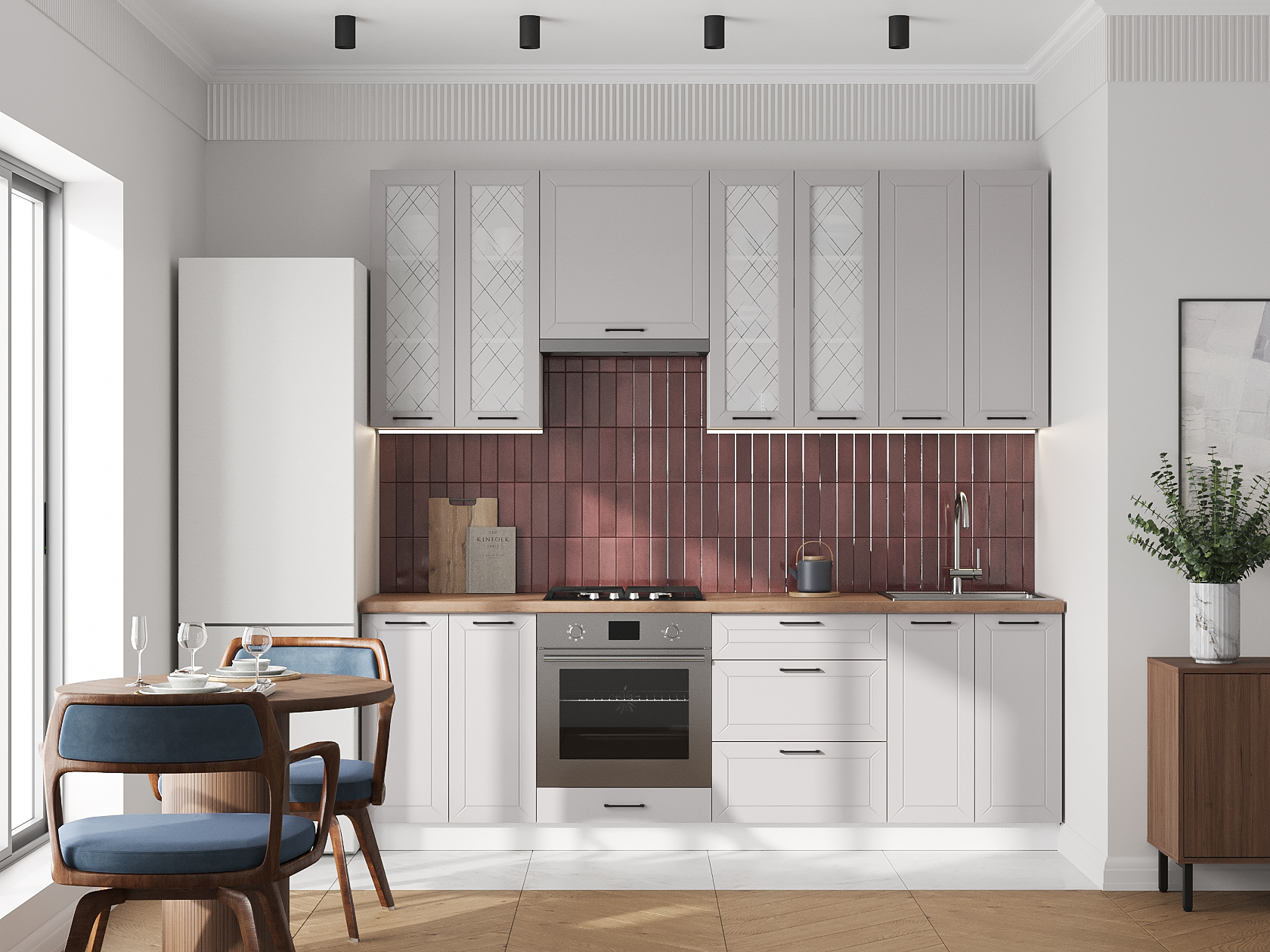 Высокий кухонный гарнитур со стеклом Вектор 240 см Белый / Нео со стеклом
