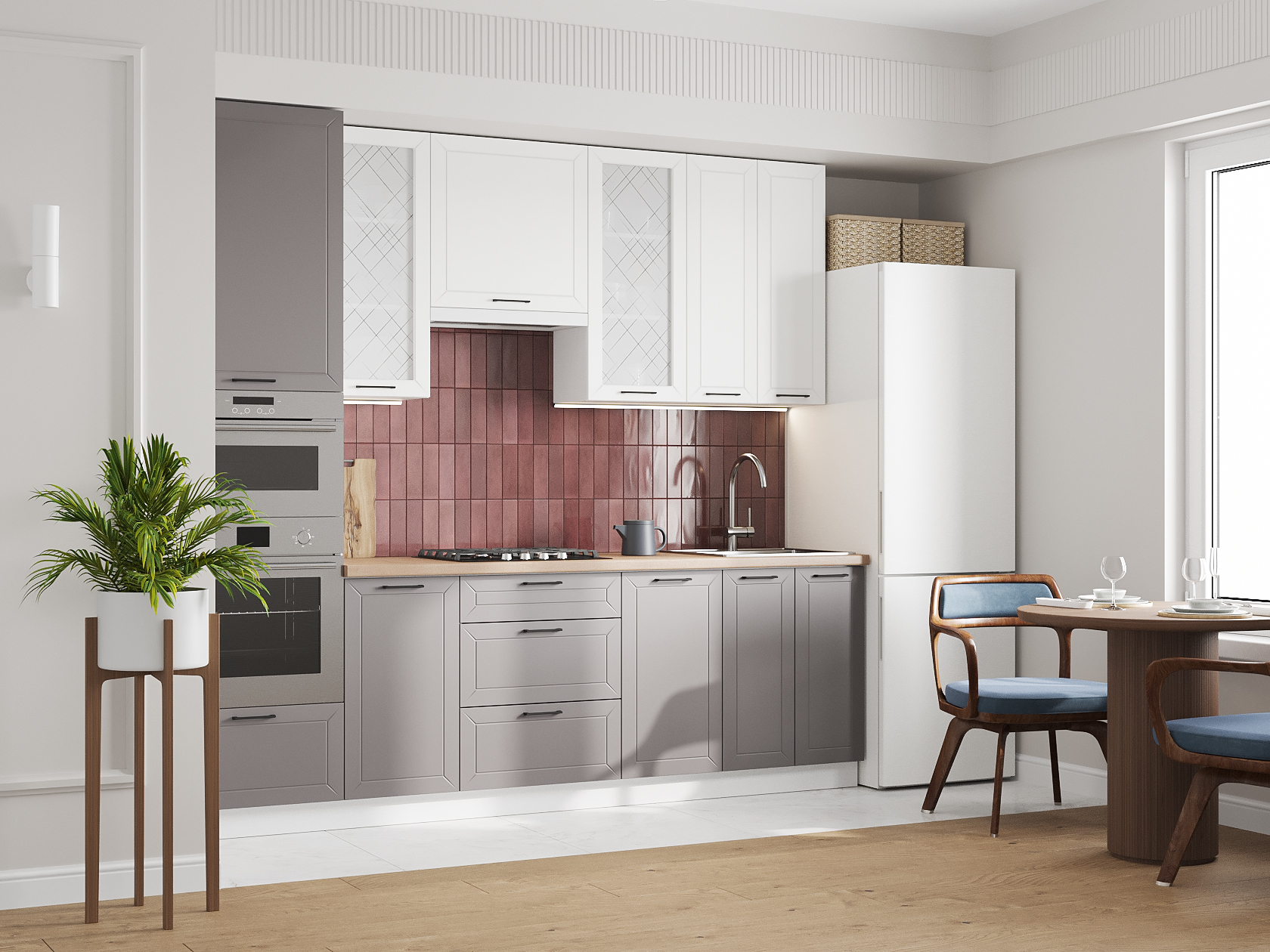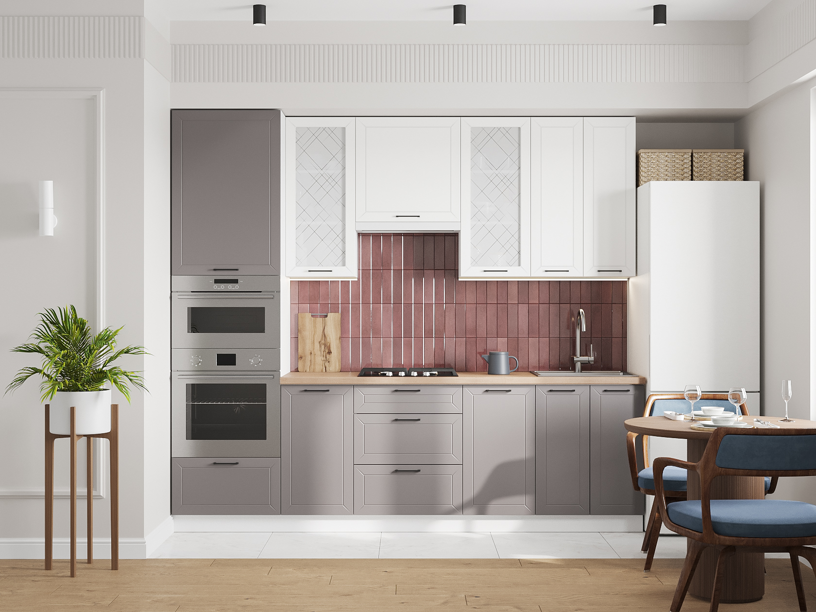 Высокий кухонный гарнитур со стеклом Вектор 260 см Белый / Бланж / Грей / Стекло