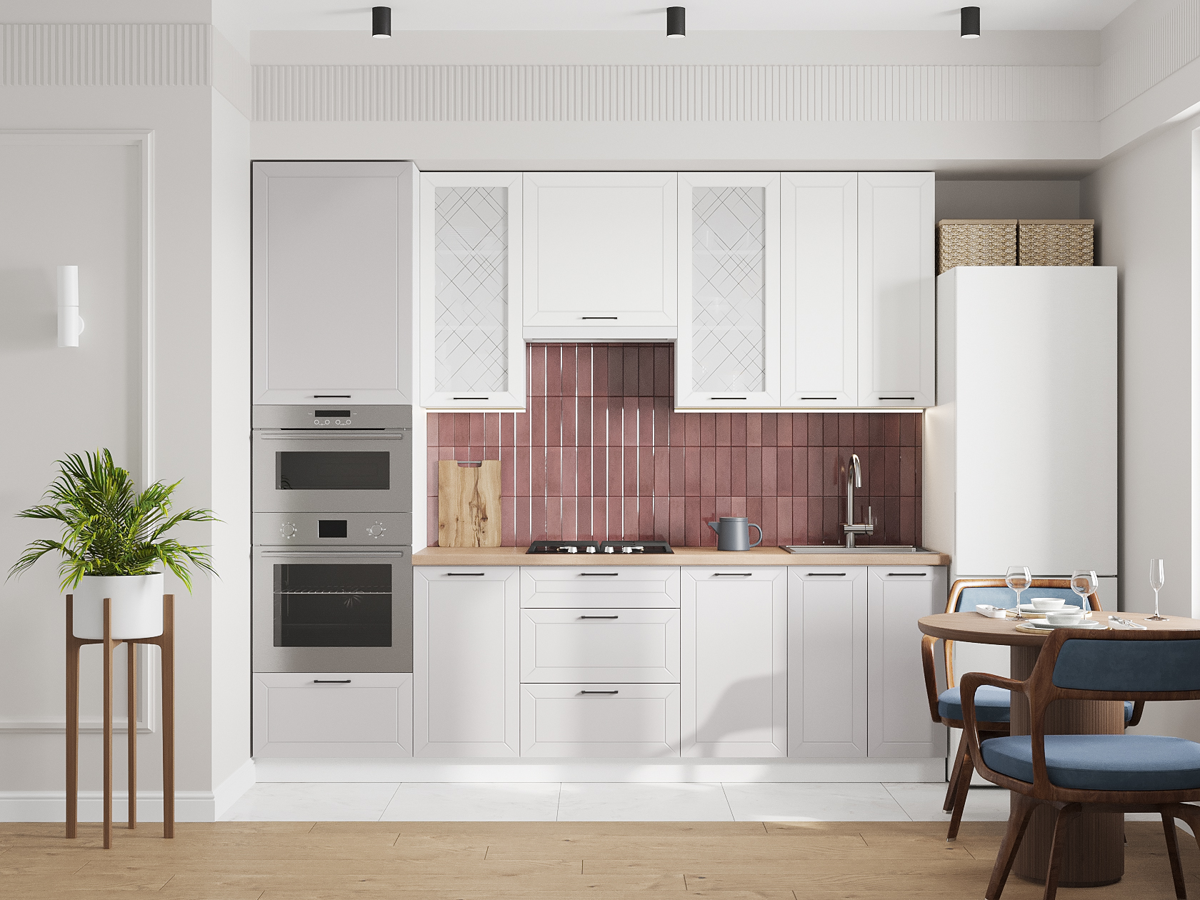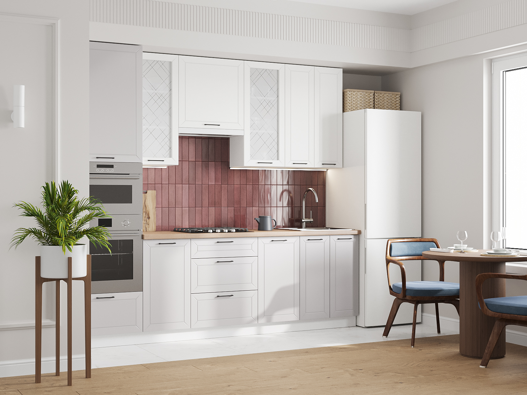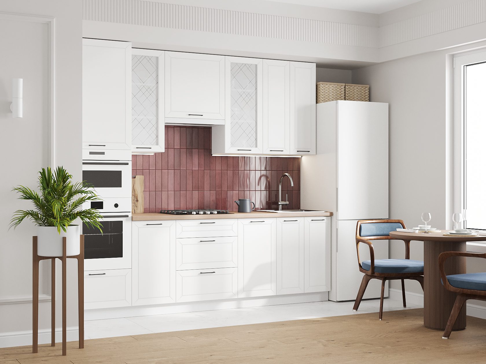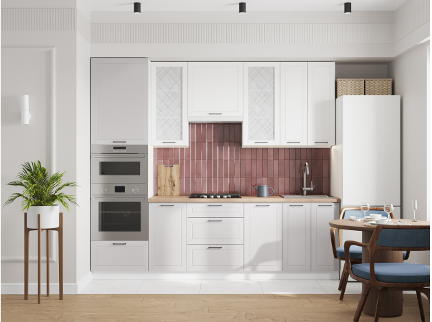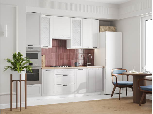 Высокий кухонный гарнитур со стеклом Вектор 260 см Белый / Бланж / Нео / Стекло