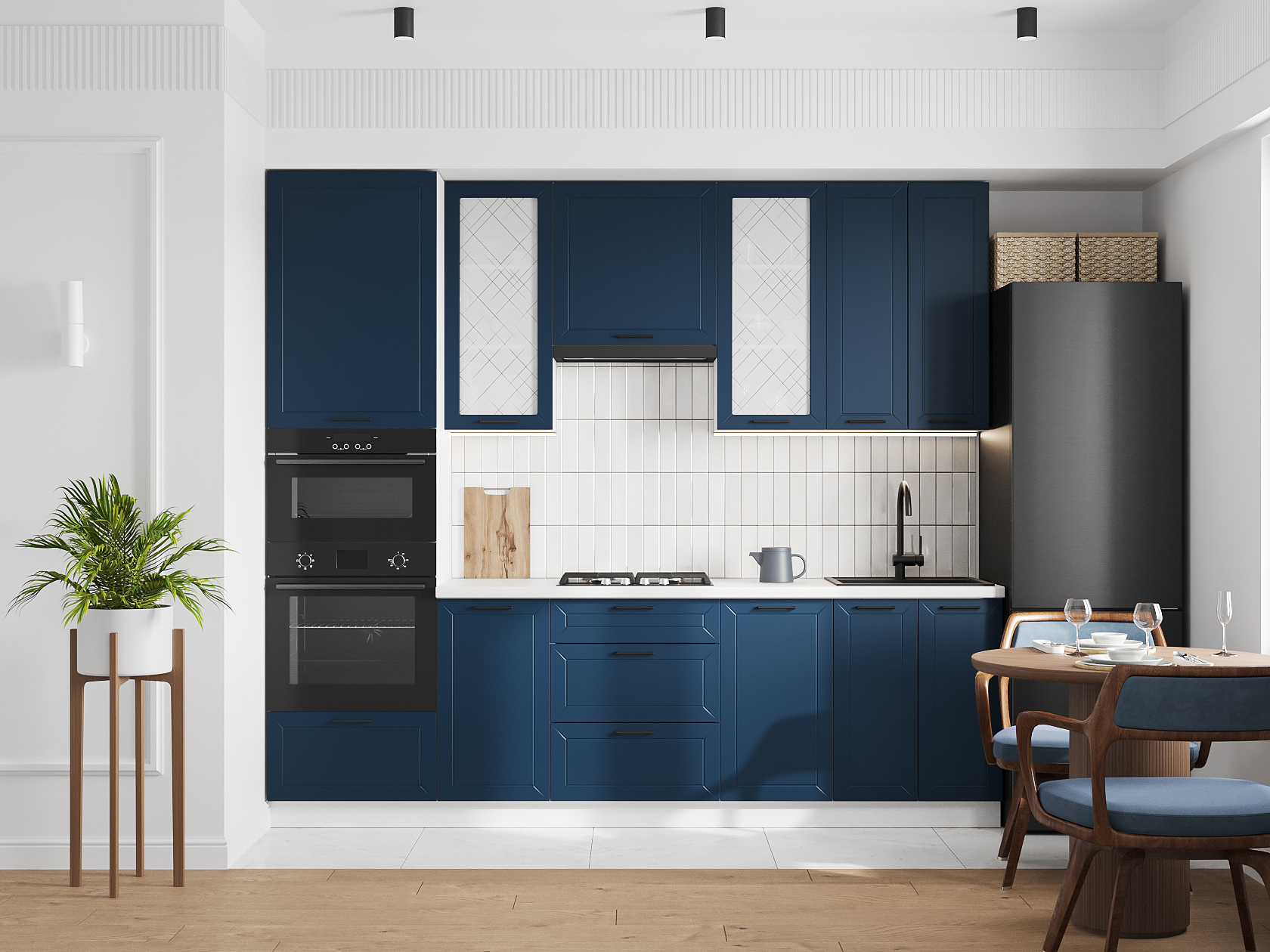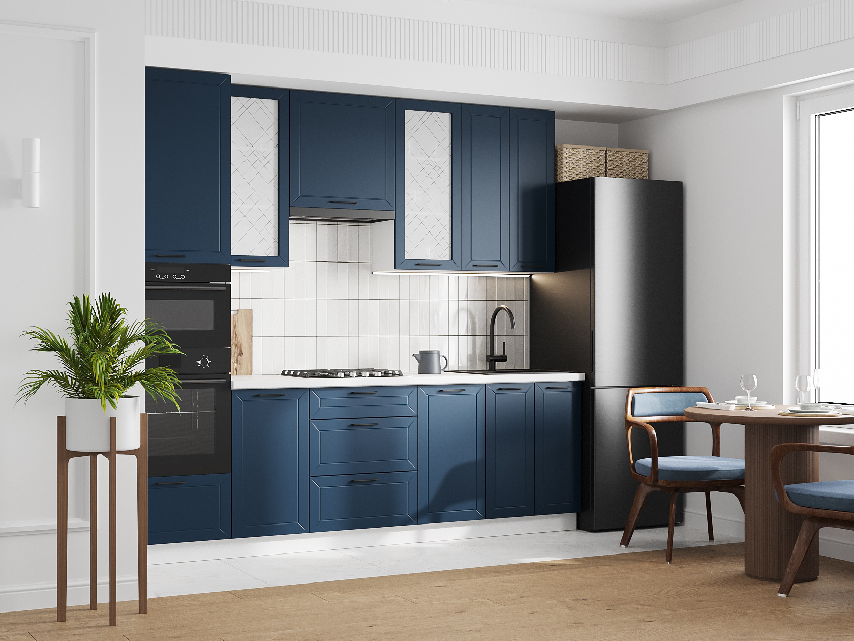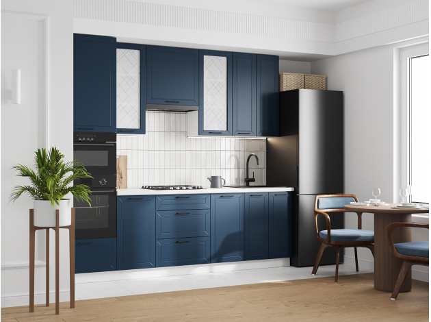 Высокий кухонный гарнитур со стеклом Вектор 260 см Белый / Океания со стеклом