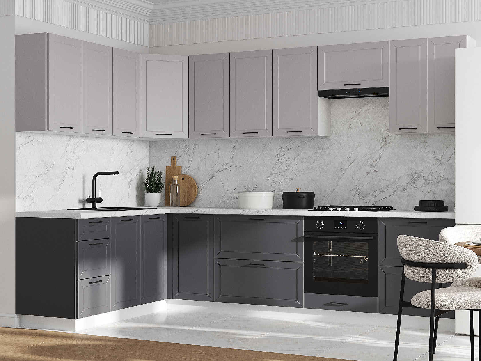 Кухонный гарнитур Вектор 300х180 см создаст уютное пространство, в котором всё продумано до мелочей. Набор объединил вместительные элементы для хранения посуды, продуктов и разной утвари, а также ниши для встраиваемой техники. Матовые фасады украшены фрезеровкой, с которой мебель смотрится особенно привлекательно.
