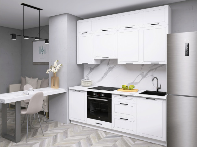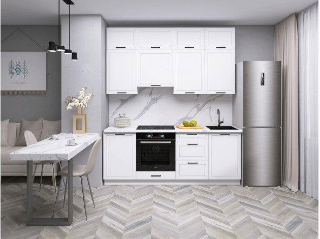 Кухонный гарнитур Вектор 210 см — оптимальное решение, с которым имеющееся пространство используется максимально эффективно. Два ряда верхних шкафов расширяют возможности для хранения и придают интерьеру более завершенный вид. В оформлении фасадов прослеживается тренд на сдержанные оттенки и лаконичные акценты.