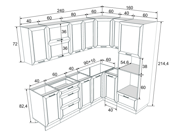 - Угловой навесной шкаф: 72 х 60 х 60 см.