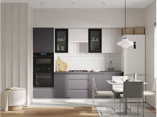 Кухонный гарнитур Вельвет 260 см подходит для небольшой квартиры, где важно оптимально использовать пространство. В верхней части расположены эстетичные шкафы-витрины, где можно хранить красивую посуду. В нижнем ряду достаточно места, чтобы спрятать утварь, формы для выпечки и другие поварские принадлежности.