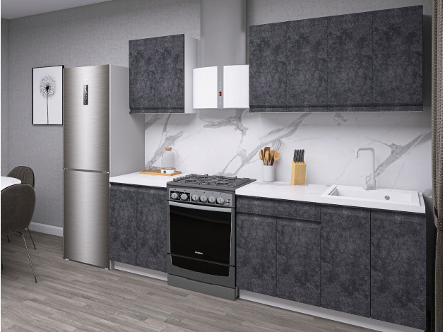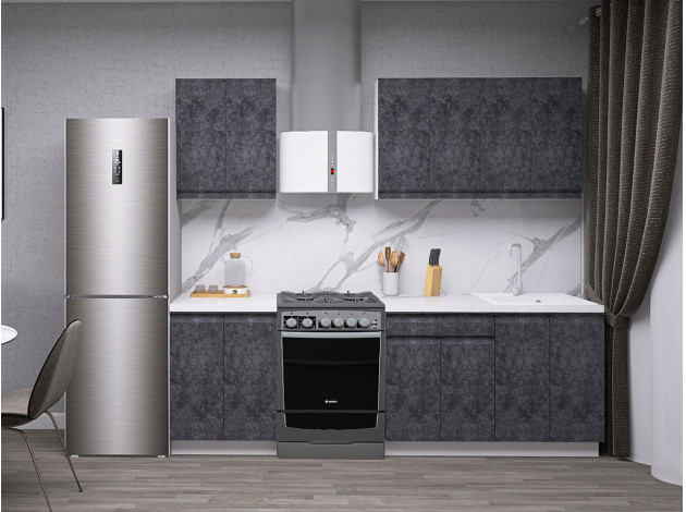 Кухонный гарнитур Вельвет 180 см поможет расположить всё необходимое на небольшой площади, чтобы готовить с комфортом. Оптимально подобранные элементы образуют удобную систему хранения, где найдется место для посуды, продуктов и другой утвари. Интегрированные ручки и фасады с текстурой бетона подчеркивают актуальный стиль мебели.