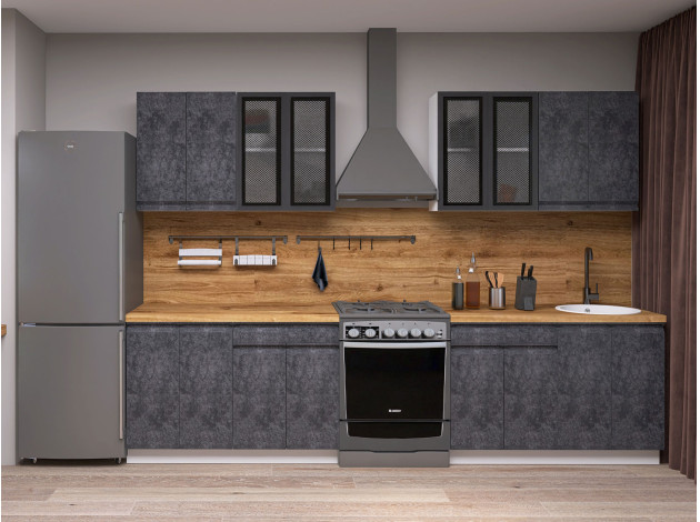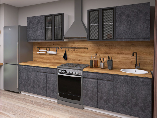 Кухонный гарнитур Вельвет 240 см — стильное и функциональное решение для меблировки современного интерьера. Интегрированные ручки и фасады с текстурой бетона смотрятся очень актуально. Стеклянные дверцы визуально облегчают гарнитур. Благодаря качественной фурнитуре с доводчиками пользоваться мебелью очень удобно.