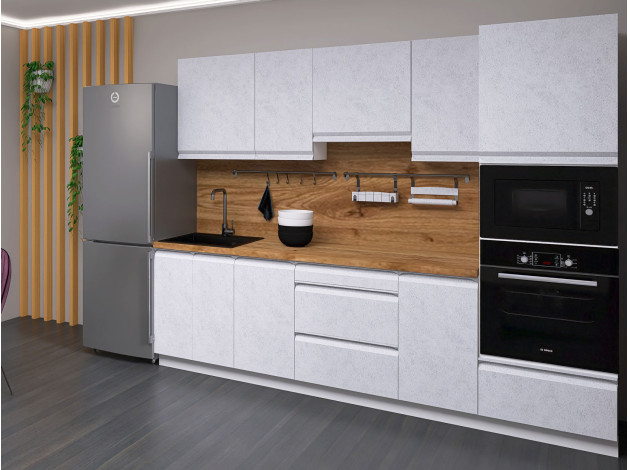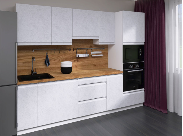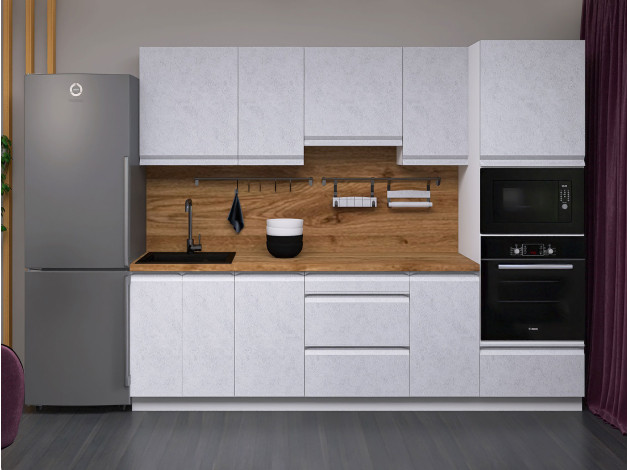 Кухонный гарнитур Вельвет 260 см — готовое решение для небольшого помещения. Оптимально подобранные элементы создают удобную систему хранения и комфортную зону для приготовления пищи. Поверхность фасадов напоминает шлифованный бетон и смотрится очень актуально. Качественная фурнитура с доводчиками — важное преимущество гарнитура.