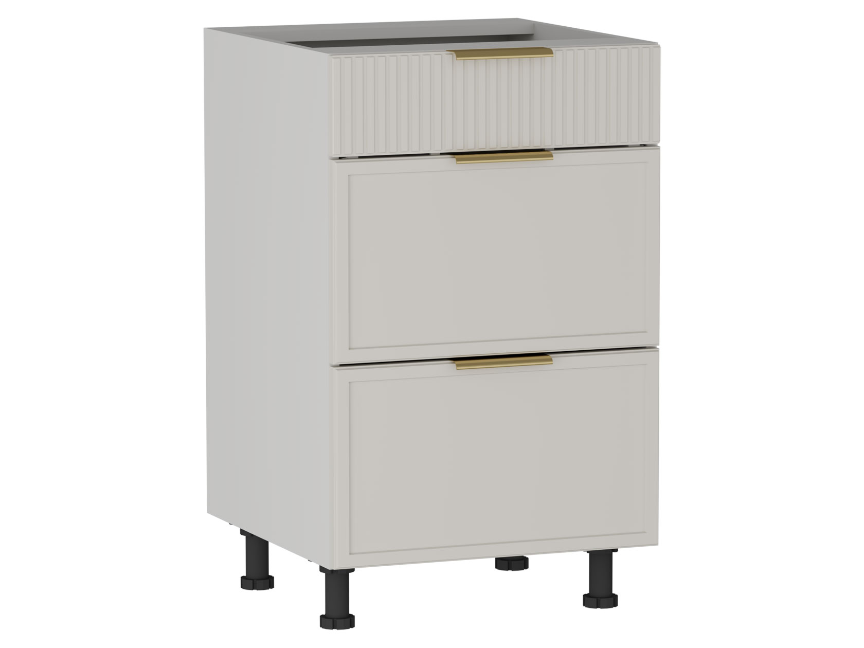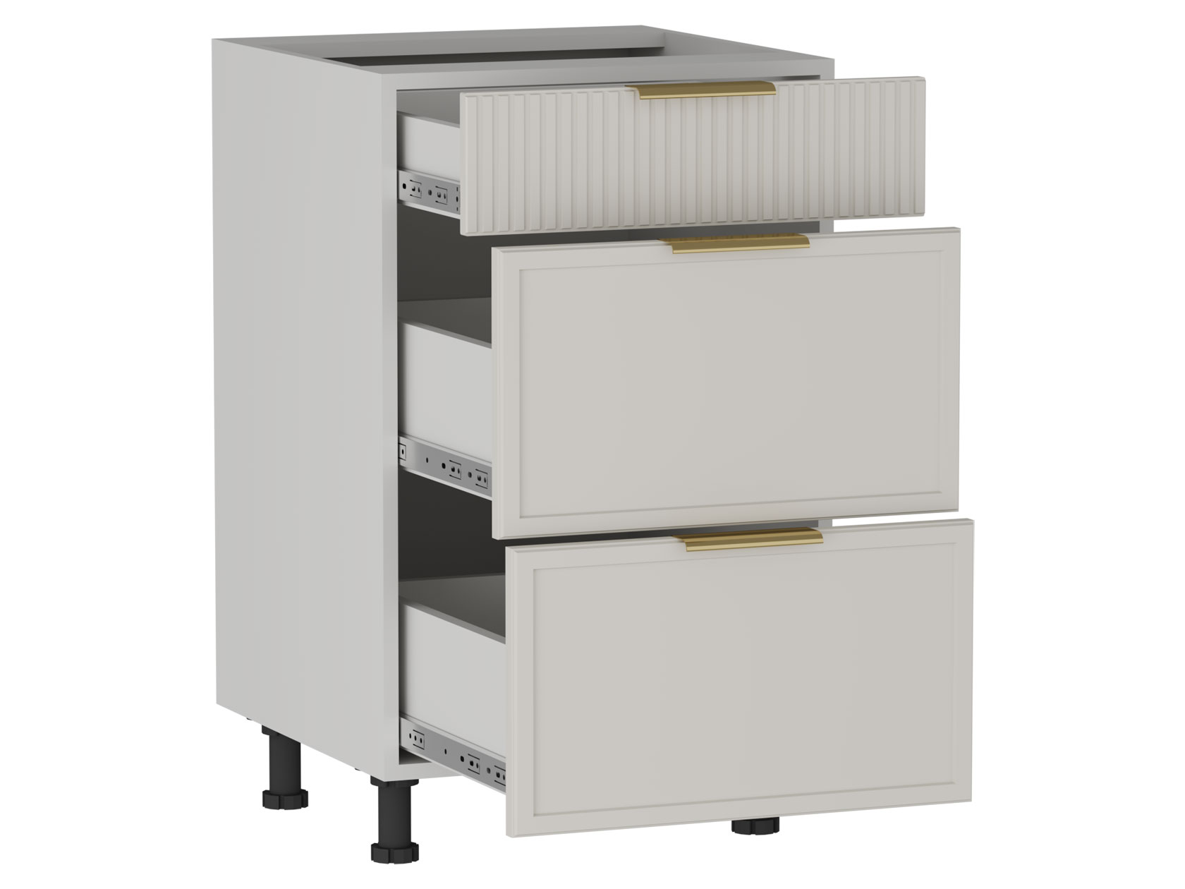Стол Берта 3 ящика поможет поддерживать порядок на кухне. Внутреннее наполнение предусматривает удобные выдвижные ящики для хранения столовых приборов и различной утвари. Матовые фасады с фрезеровкой в виде тонких рамок и вертикальных линий подчеркивают стильный облик модуля. Поверхность легко очищается от любых загрязнений, не портится от влаги и высокой температуры.