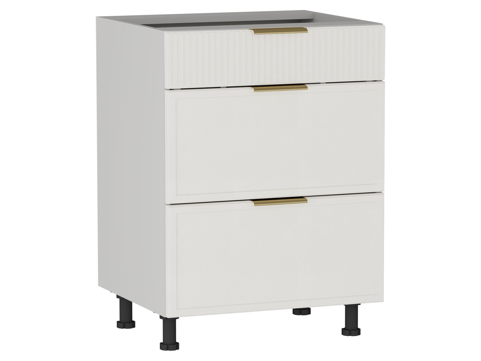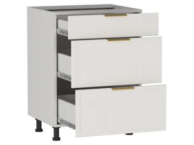• Стол Берта 3 ящика поможет поддерживать порядок на кухне. Внутреннее наполнение предусматривает удобные выдвижные ящики для хранения столовых приборов и различной утвари. Матовые фасады с фрезеровкой в виде тонких рамок и вертикальных линий подчеркивают стильный облик модуля. Поверхность легко очищается от любых загрязнений, не портится от влаги и высокой температуры.