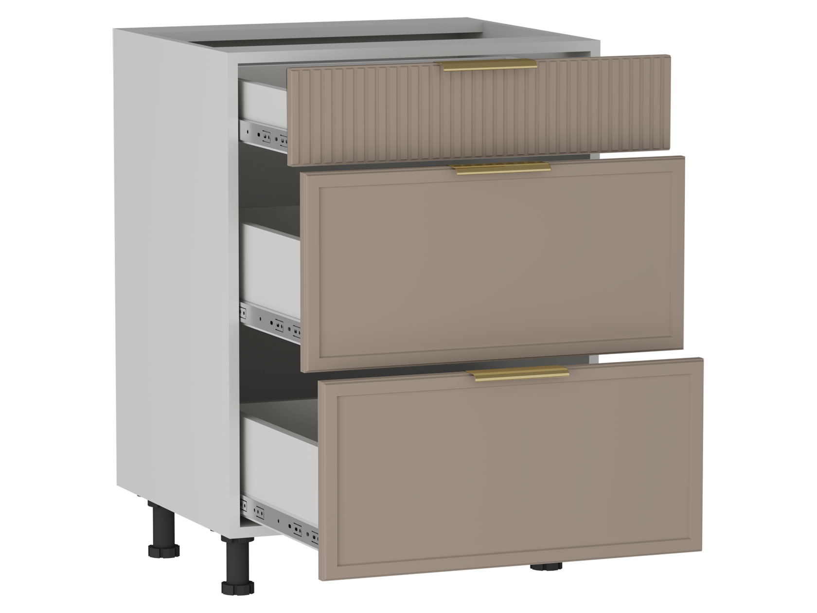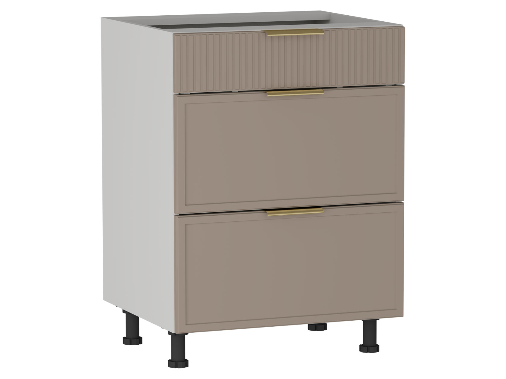 • Стол Берта 3 ящика поможет поддерживать порядок на кухне. Внутреннее наполнение предусматривает удобные выдвижные ящики для хранения столовых приборов и различной утвари. Матовые фасады с фрезеровкой в виде тонких рамок и вертикальных линий подчеркивают стильный облик модуля. Поверхность легко очищается от любых загрязнений, не портится от влаги и высокой температуры.