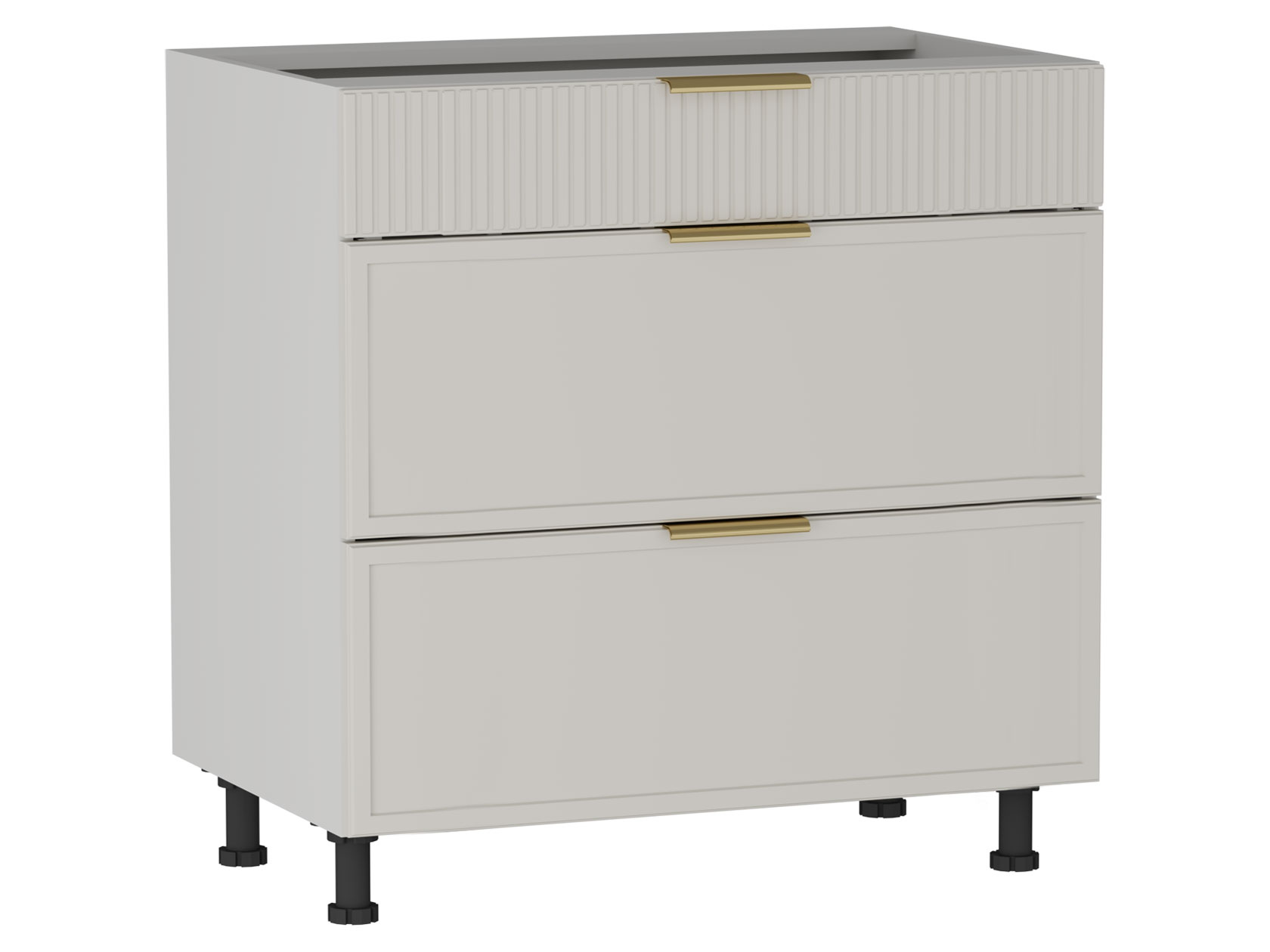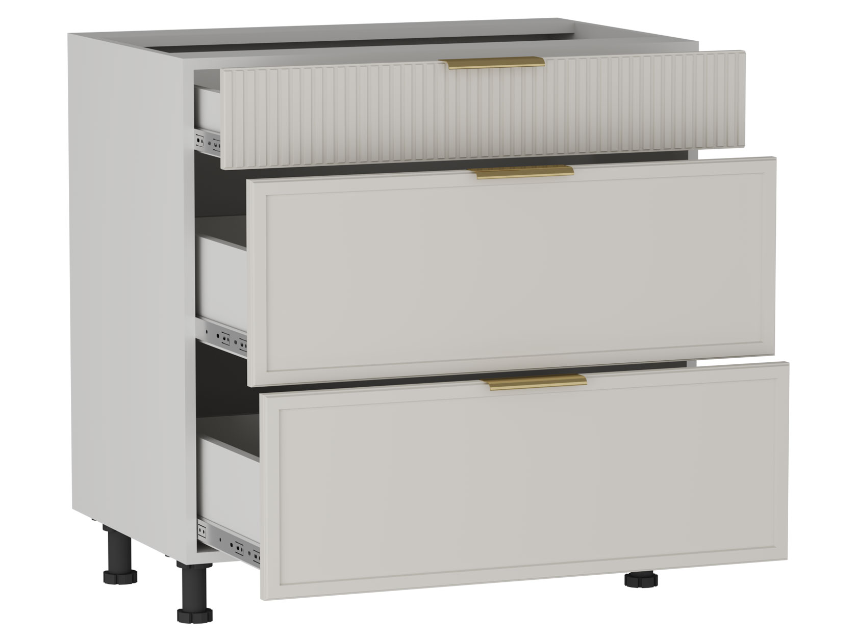 Стол Берта 3 ящика поможет поддерживать порядок на кухне. Внутреннее наполнение предусматривает удобные выдвижные ящики для хранения столовых приборов и различной утвари. Матовые фасады с фрезеровкой в виде тонких рамок и вертикальных линий подчеркивают стильный облик модуля. Поверхность легко очищается от любых загрязнений, не портится от влаги и высокой температуры.