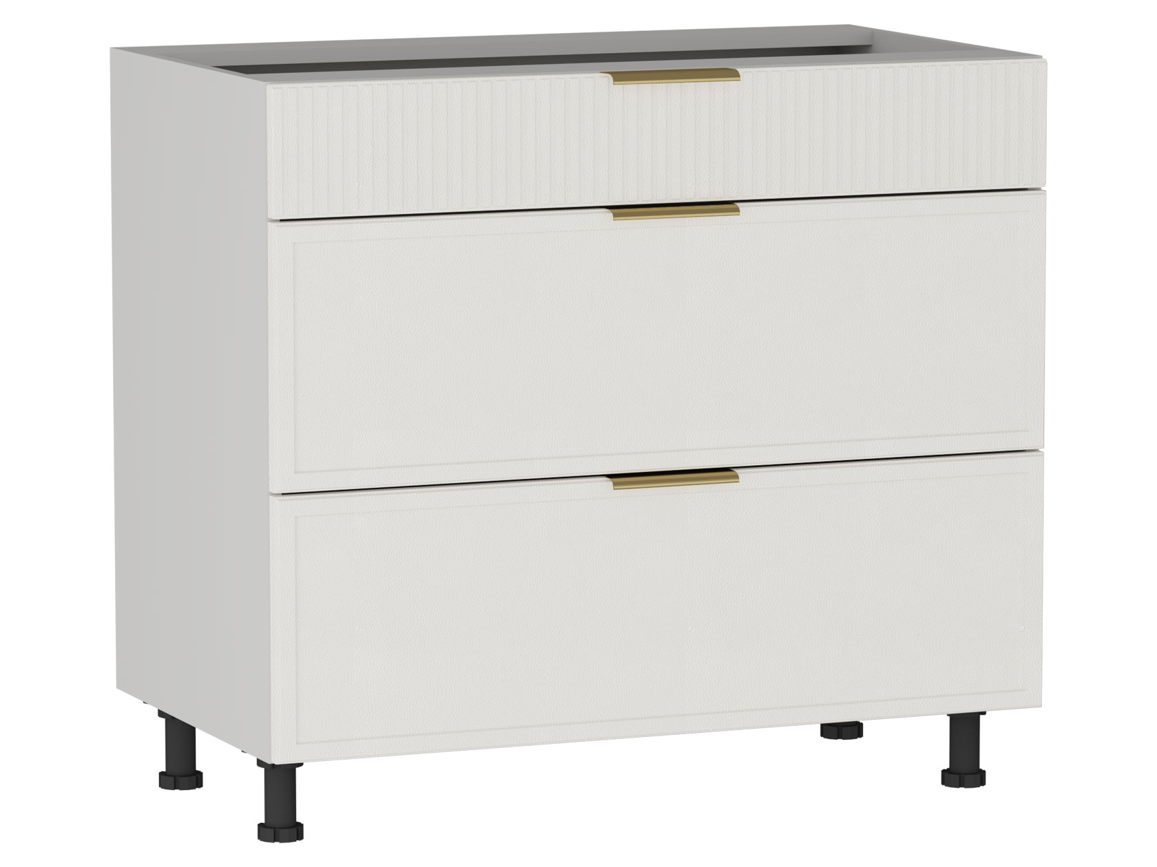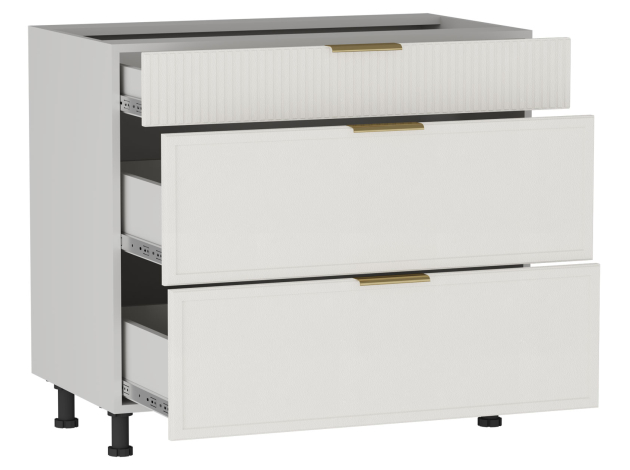 • Стол Берта 3 ящика поможет поддерживать порядок на кухне. Внутреннее наполнение предусматривает удобные выдвижные ящики для хранения столовых приборов и различной утвари. Матовые фасады с фрезеровкой в виде тонких рамок и вертикальных линий подчеркивают стильный облик модуля. Поверхность легко очищается от любых загрязнений, не портится от влаги и высокой температуры.