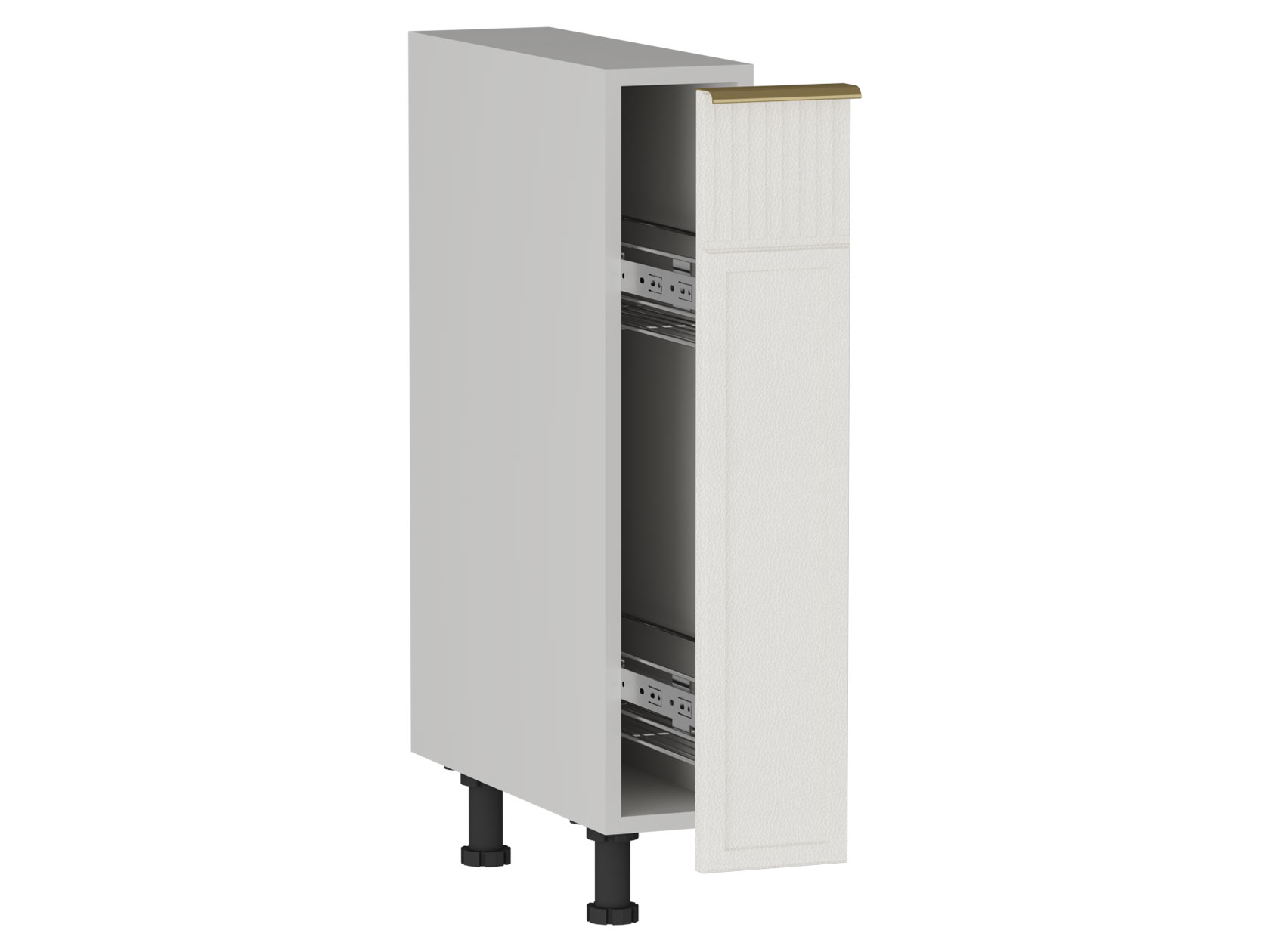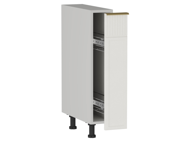 Бутылочница Берта — практичный модуль для удобного хранения емкостей с маслами, специями и приправами. Компактное размещение экономит пространство на столешнице и в других шкафах. Матовый фасад с изящной фрезеровкой и контрастной золотой ручкой придает мебели особое очарование.