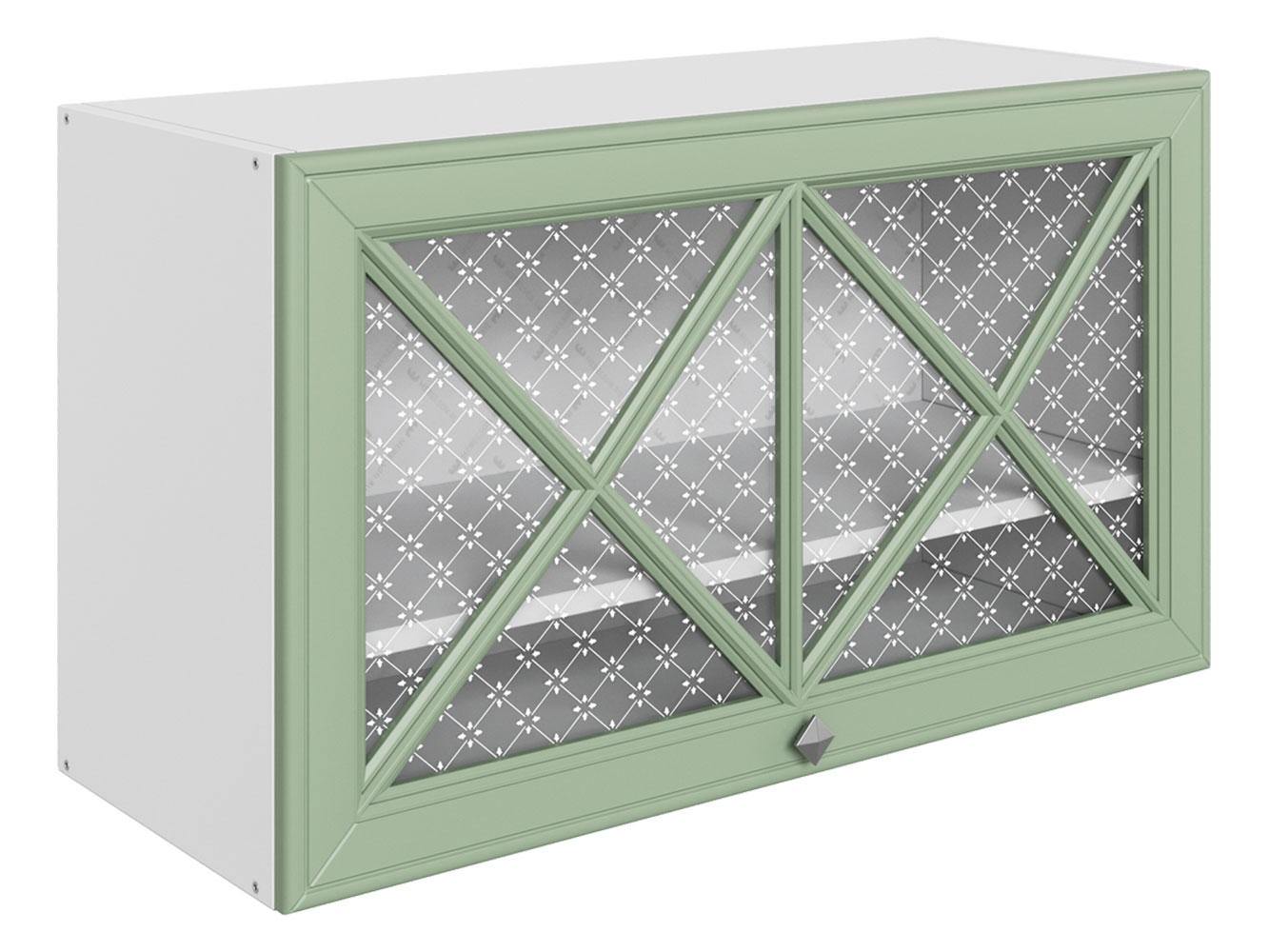 • Навесной шкаф Мишель — вместительный и стильный модуль для хранения. Фасад украшен стеклом с узором и декоративными планками, поэтому смотрится очень привлекательно. Внутри можно красиво расставить посуду для сервировки и другую утварь.