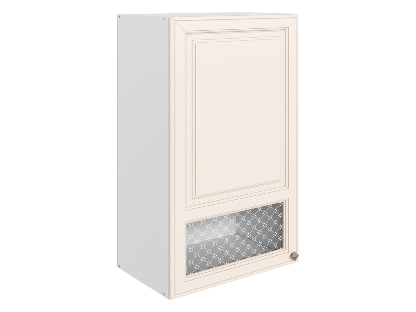 • Навесной шкаф Мишель — стильное дополнение кухонного гарнитура. Стеклянные вставки с очаровательным узором украшают элегантные рамочные фасады. За распашными дверцами находится отделение с полками, где удобно хранить посуду для сервировки, чай, кофе или специи.
