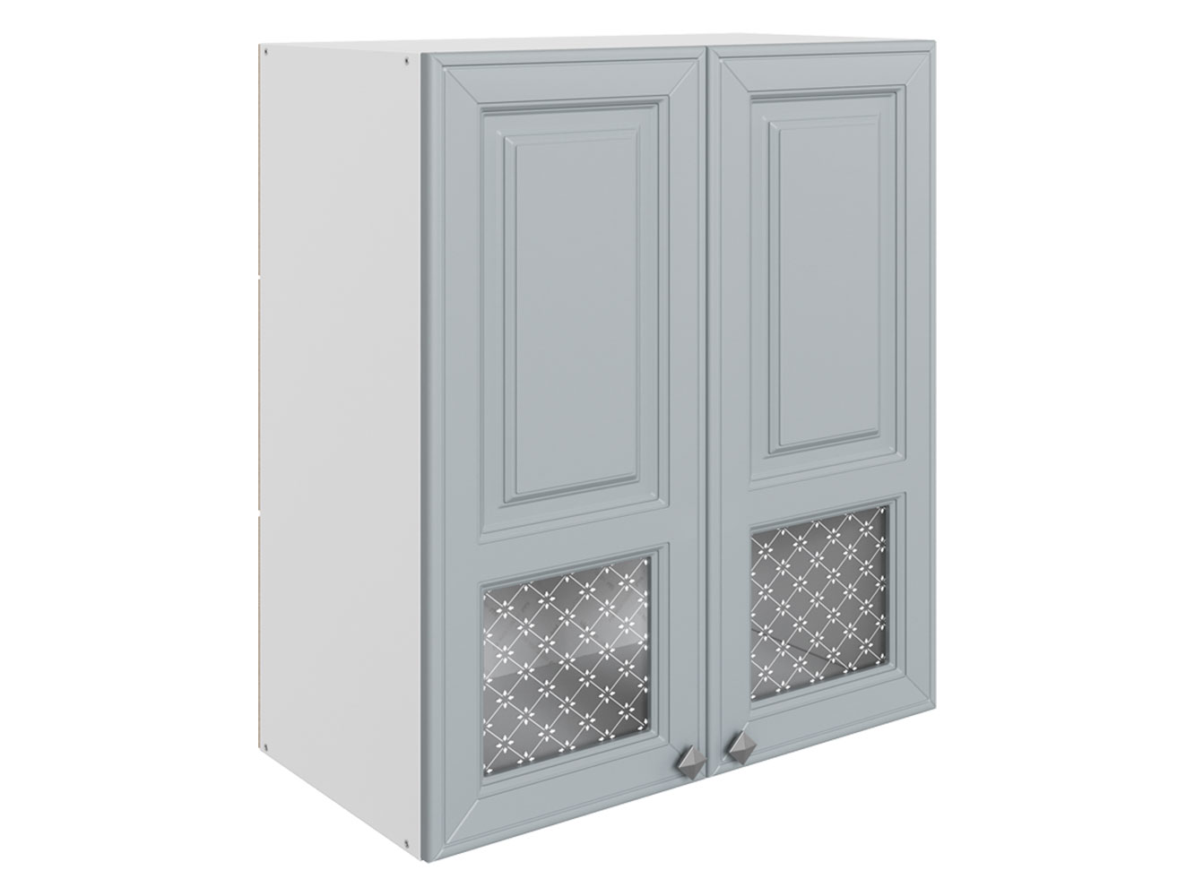 Навесной шкаф Мишель привлекает внимание стеклянными вставками с очаровательным узором. За распашными дверцами находится отделение с полкой, где удобно хранить посуду для сервировки, чай, кофе или специи.