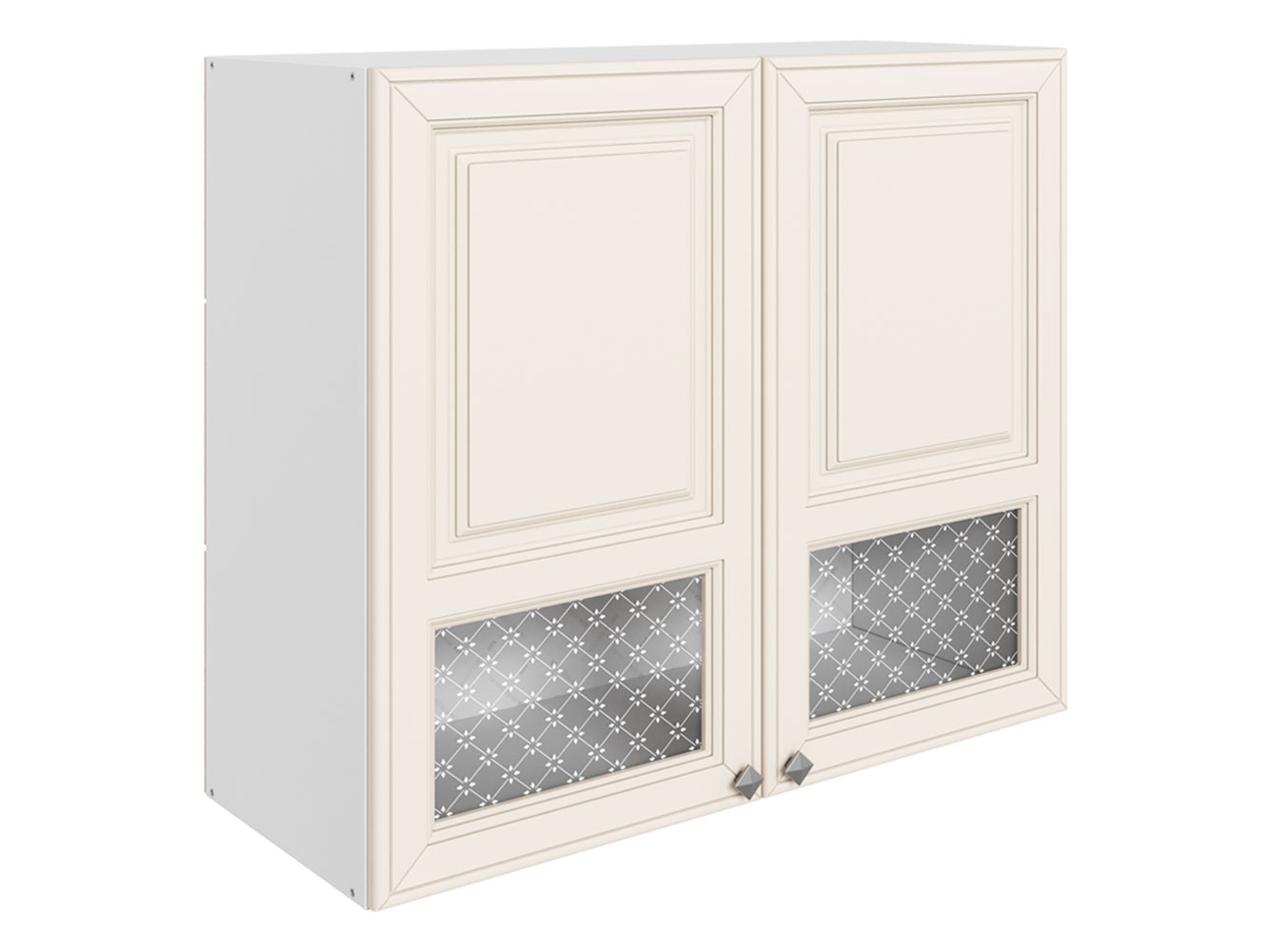 • Навесной шкаф Мишель привлекает внимание стеклянными вставками с очаровательным узором. За распашными дверцами находится отделение с полкой, где удобно хранить посуду для сервировки, чай, кофе или специи.