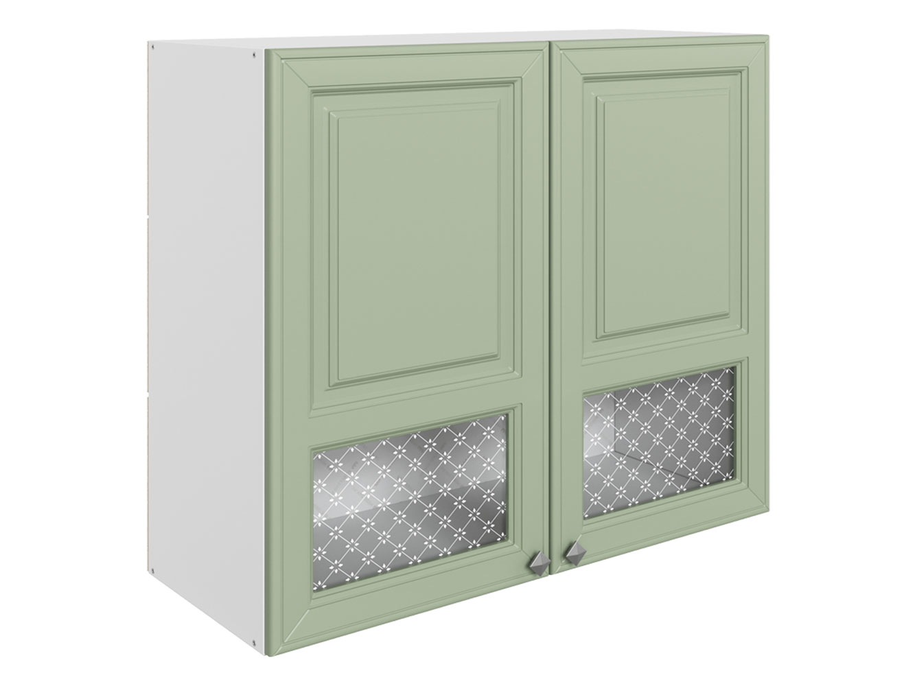 • Навесной шкаф Мишель привлекает внимание стеклянными вставками с очаровательным узором. За распашными дверцами находится отделение с полкой, где удобно хранить посуду для сервировки, чай, кофе или специи.