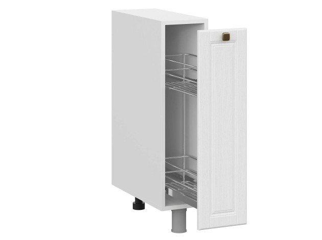 Бутылочница Прованс оборудована выдвижным ящиком, в котором расположены две корзины с бортиками. Внутри удобно хранить емкости с маслами и приправами, запас моющих средств и аксессуары. Модуль станет удобным дополнением кухонного гарнитура.