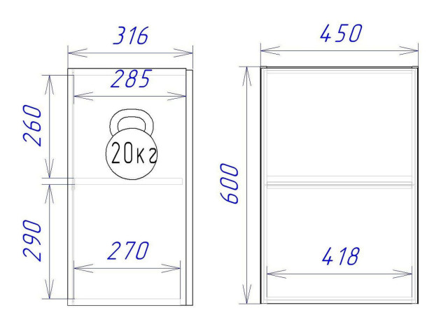 - Максимальная нагрузка на полку: 20 кг.