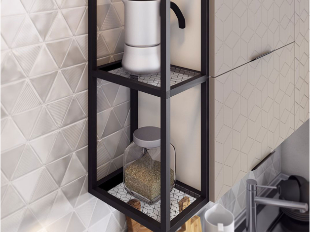 Шкаф Стоун объединил в своей конструкции эстетику и функциональность. Модуль подходит в качестве дополнения верхней части кухонного гарнитура. Полки из стекла позволяют хранить посуду и другие детали интерьера.