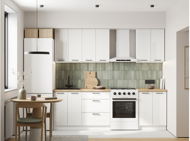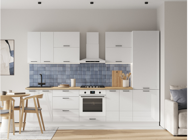 Шкаф Стрэйт — базовый элемент кухонного гарнитура, где удобно хранить посуду, специи, продукты и небольшую технику. Глянцевые фасады придают модулю визуальную легкость и просто очищаются от разных загрязнений. Специальное покрытие обеспечивает устойчивость поверхности к появлению царапин, воздействию влаги и ультрафиолета.