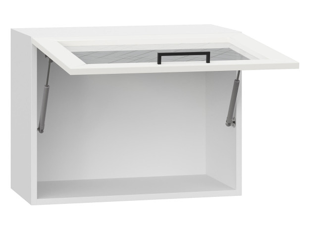 • Антресольный шкаф Вектор оборудован откидной дверцей, которая легко фиксируется в поднятом состоянии. Фрезеровка и узор на стекле делают модуль особенно привлекательным. Внутри удобно хранить сервировочную посуду, чай, кофе и разную утварь.