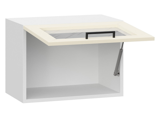 Антресольный шкаф Вектор оборудован откидной дверцей, которая фиксируется в поднятом состоянии. Фрезеровка и узор на стекле делают модуль особенно привлекательным. Внутри удобно хранить сервировочную посуду, чай, кофе и разную утварь.