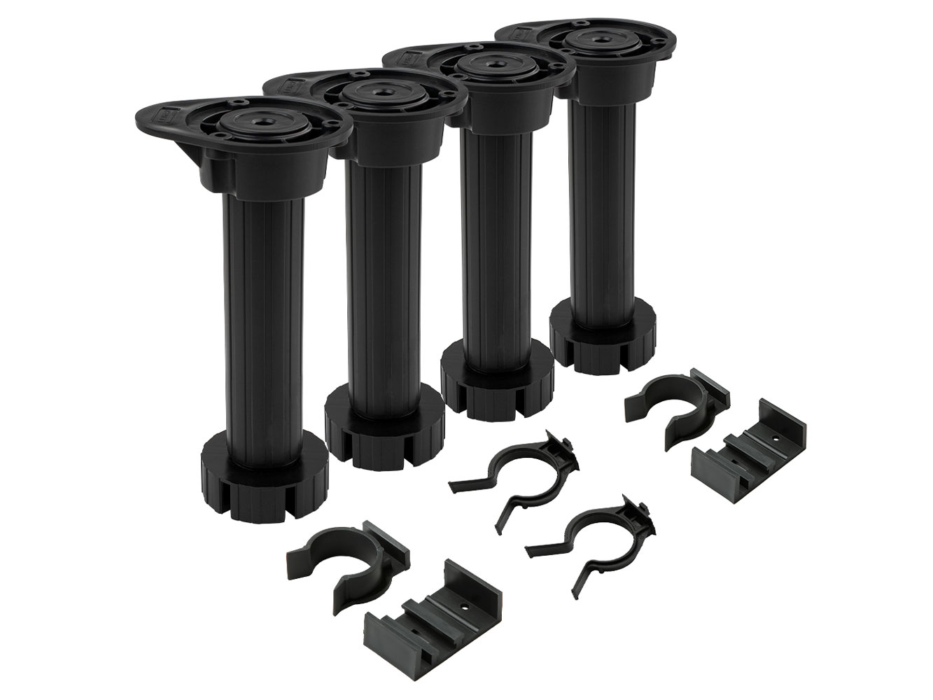 Комплект опор 4 шт. позволяет выровнять мебель на полу с перепадами высоты. Удобный механизм и прочный материал обеспечивают устойчивость и выдерживают большие нагрузки. Высоту можно регулировать вверх и вниз в зависимости от особенностей и габаритов модулей.