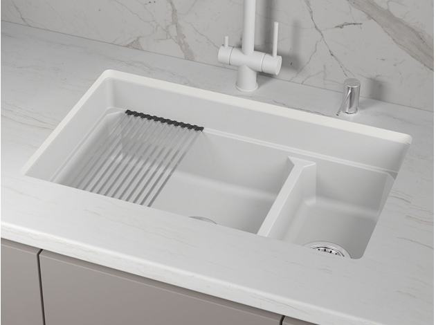 Врезная мойка Гранула 7304 с двумя чашами — идеальное решение для современной кухни. Прямоугольная форма обеспечивает удобство и функциональность. Большая чаша оборудована удобной площадкой для ролл-мата или разделочной доски. Плотный композитный кварц гарантирует долговечность конструкции и защиту от механических повреждений. Универсальный дизайн придает обстановке стильный вид и сочетается с разными стилями гарнитуров.