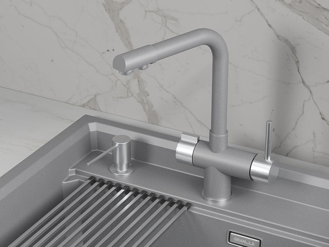 • Смеситель GR-5008 — идеальное сочетание стиля и функциональности. Надежный материал отличается прочностью и устойчивостью к коррозии. Рычажное управление обеспечивает легкость в регулировке напора и температуры воды. Поворотный излив добавляет удобства во время мытья крупногабаритной посуды. Матовое покрытие придает аксессуару современный вид и облегчает уход за поверхностью.