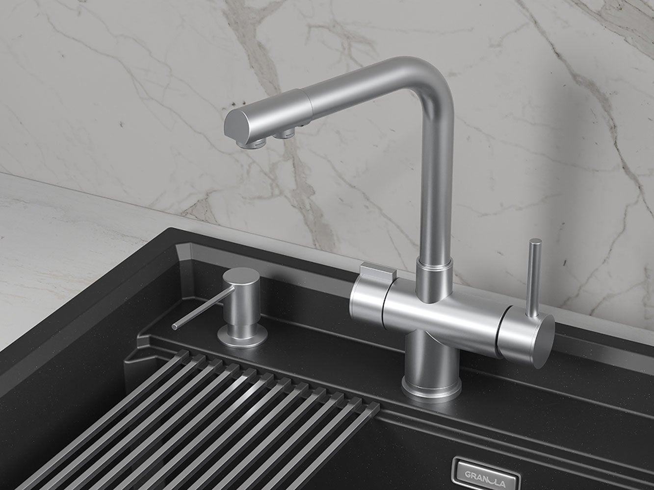 • Смеситель GR-5008 — идеальное сочетание стиля и функциональности. Надежный материал отличается прочностью и устойчивостью к коррозии. Рычажное управление обеспечивает легкость в регулировке напора и температуры воды. Поворотный излив добавляет удобства во время мытья крупногабаритной посуды. Матовое покрытие придает аксессуару современный вид и облегчает уход за поверхностью.