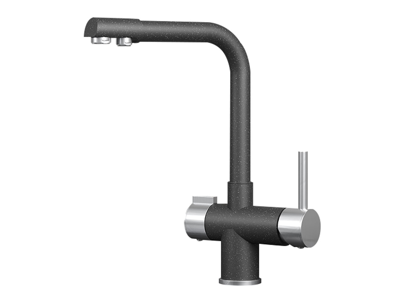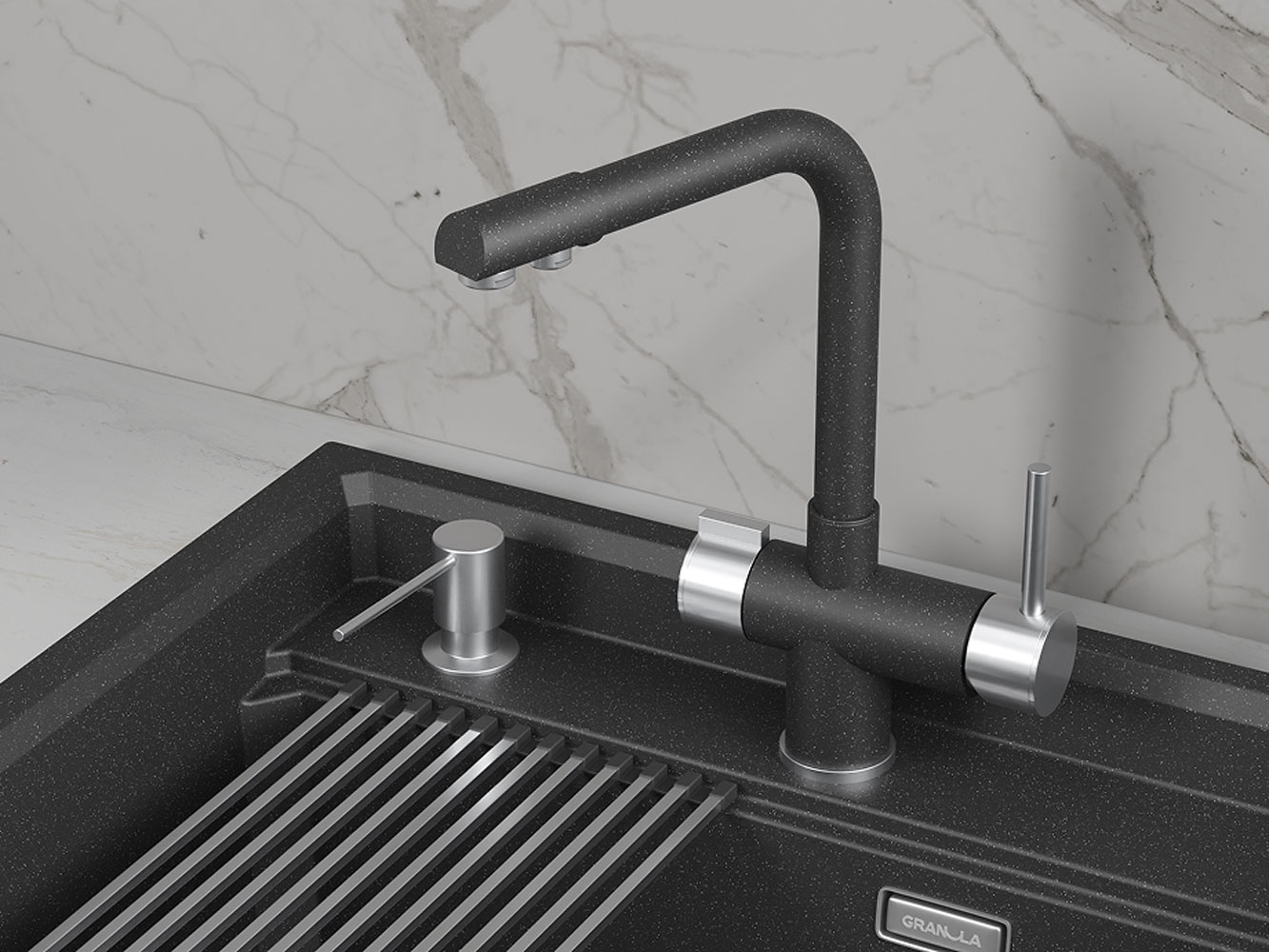 • Смеситель GR-5008 — идеальное сочетание стиля и функциональности. Надежный материал отличается прочностью и устойчивостью к коррозии. Рычажное управление обеспечивает легкость в регулировке напора и температуры воды. Поворотный излив добавляет удобства во время мытья крупногабаритной посуды. Матовое покрытие придает аксессуару современный вид и облегчает уход за поверхностью.